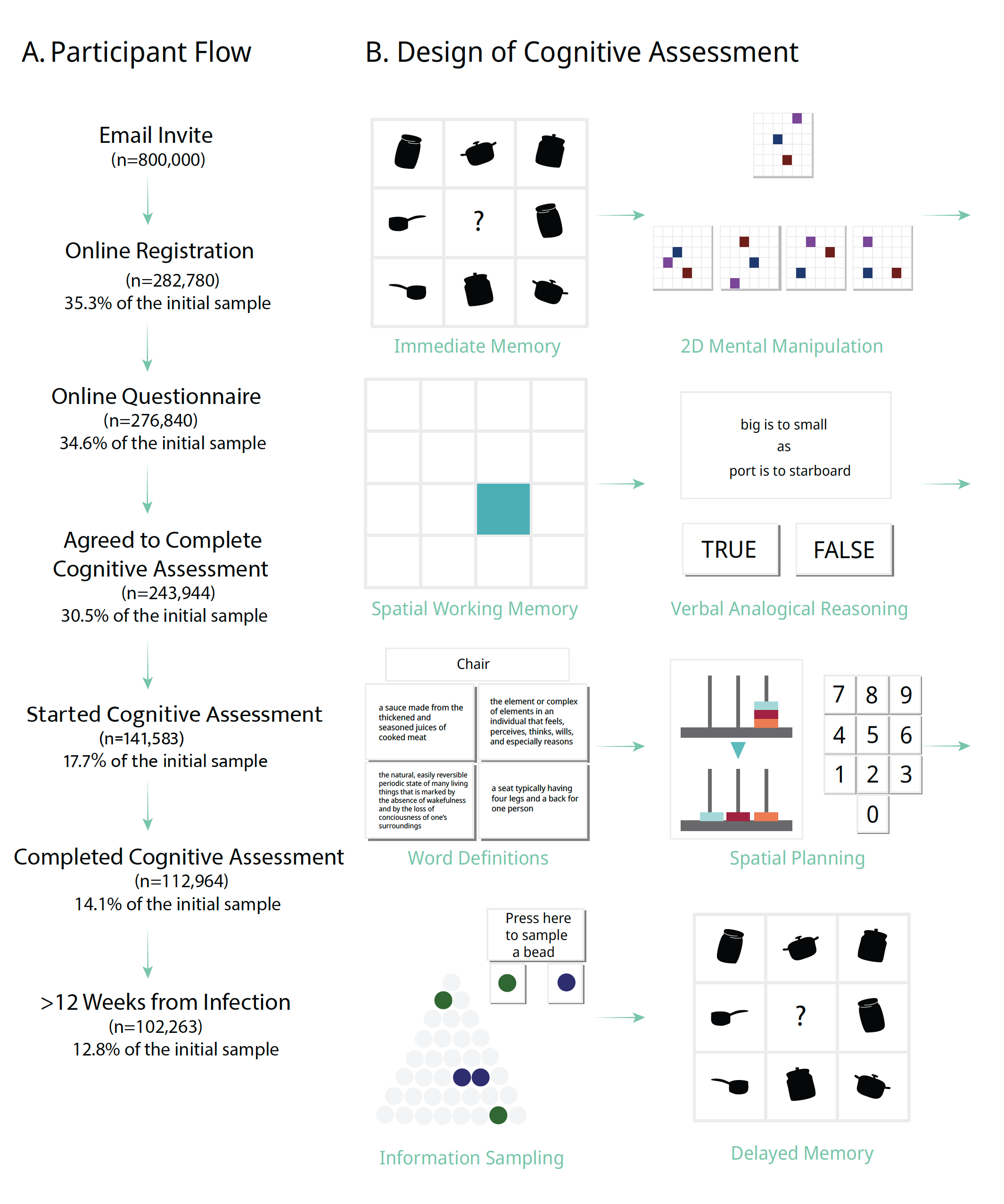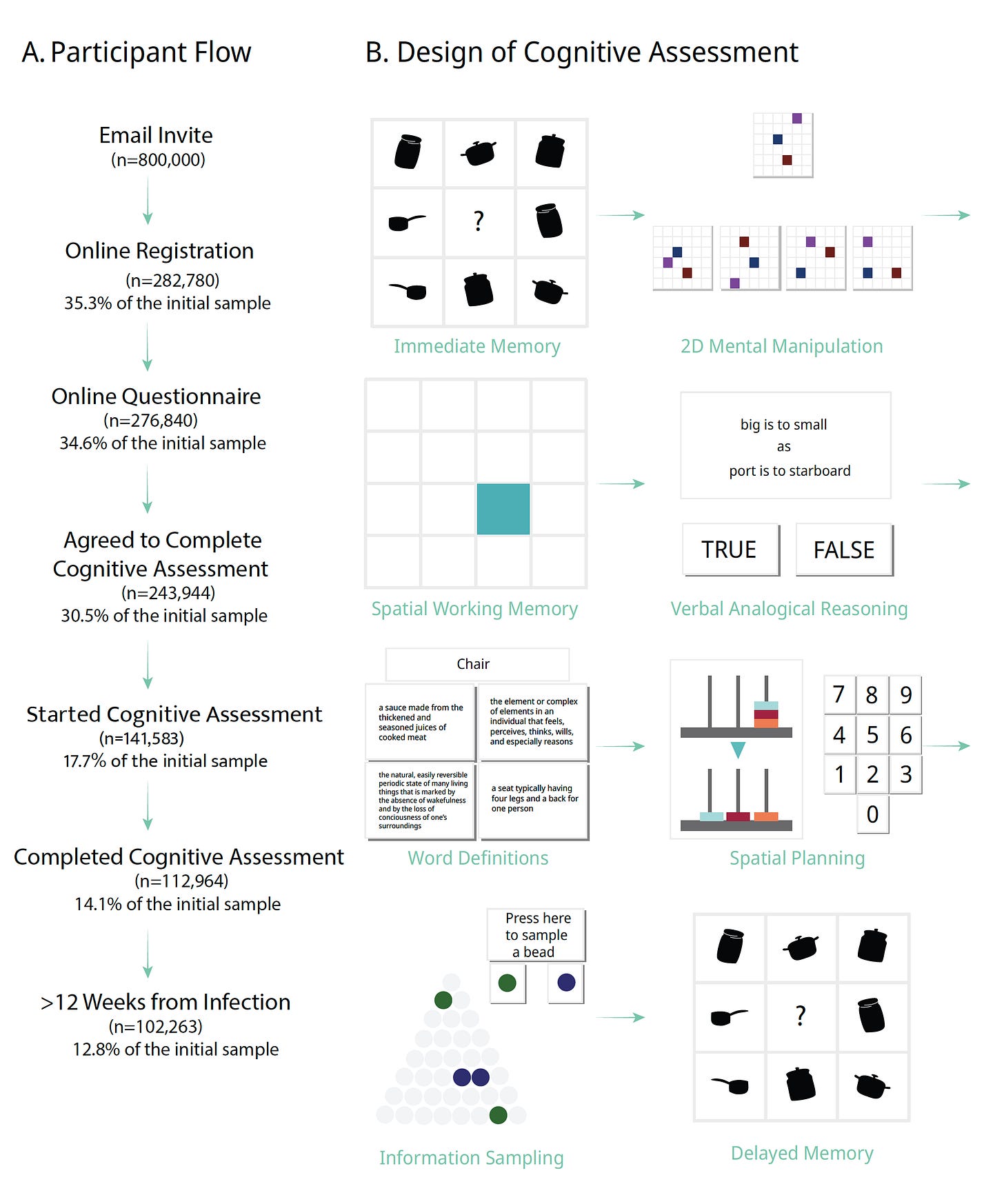 In England, in a prospective study nearly 113,000 participants, with or without Covid infections, accepted the invitation to participate and completed a cognitive and memory assessment (see flow chart below from the 800,000 total community of participants) and after 12 weeks, with or without symptom resolution. The cognitive 8-domain assessment (right side of panel below) demonstrated that the impact of Covid was mainly seen on memory, executive function and reasoning. The adverse cognitive impact was worst with the original (ancestral) virus and the Alpha variant, compared with subsequent Delta and Omicron variants, and there was some protective effect of vaccination.