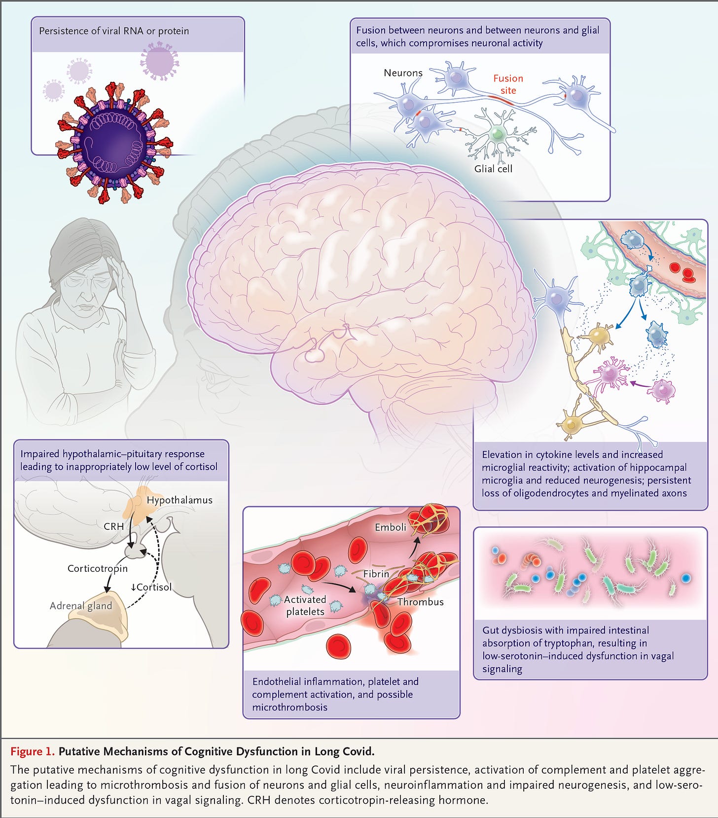 An accompanying editorial by Ziyad Al-Aly and Clifford Rosen provided important context, citing the US Population Survey with more than 1 million Americans reporting having “serious difficulty” remembering, concentrating, or making decisions than any time in the preceding years. The graphic accompanying their editorial, reviewing the different mechanisms that appear to be underpinning brain involvement from Covid, is excellent. This important topic was just reviewed by Michelle Monje in the Ground Truths podcast, as she highlighted the role of microglia activation (the most prominent immune cells in the brain, functioning like specialized macrophages in the brain) as likely playing a/the key role of promoting brain inflammation.
