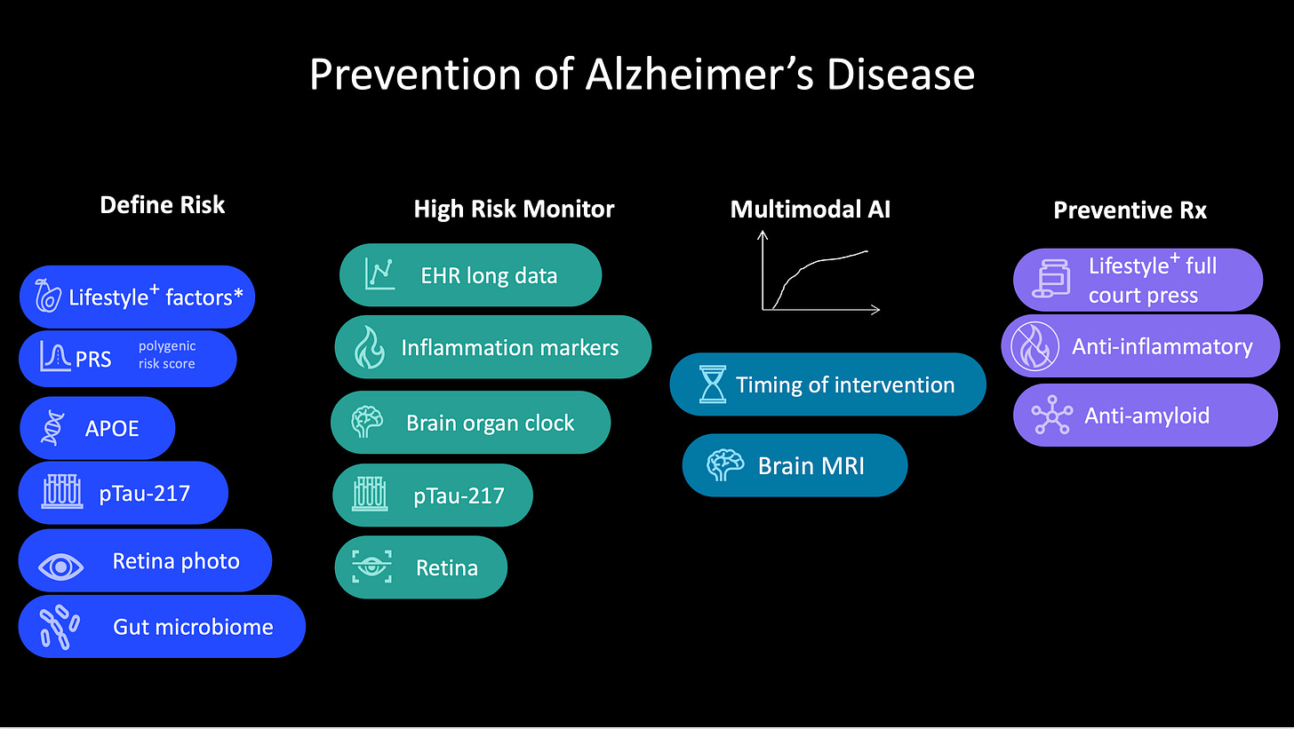 Identifying high-risk individuals for major medical conditions —which have evidence for actionability for prevention— is in the works. There are a variety of ways to improve accuracy of forecasts incorporating multiple layers of a person’s data, fully integrating the data via multimodal A.I.. A goal is not just to partition a high-risk status for a specific disease, but also the likely timing the condition may manifest, since, for example, just carrying “high-risk” but its likely occurence after age 90+ has much less significance. Similarly, the added knowledge of likely timing applies as to when to initiate an intervention.