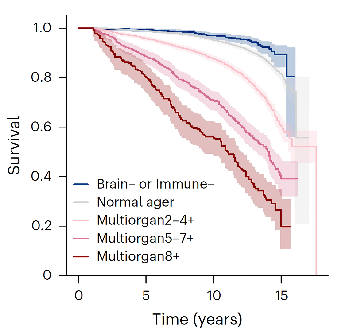 smoking with increased lung, brain, and organismal aging. The most important organ clocks related to improved survival were the brain and immune system clocks, as seen in the Figure below (same as Figure 12.5 in SUPER AGERS) The top blue line represents people with slow aging of the brain or immune clock.
