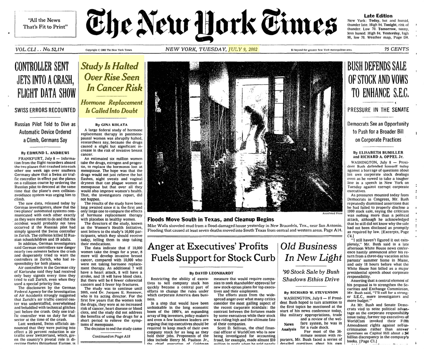 Almost exactly 23 years ago, the Women’s Health Initiative (WHI) large, randomized clinical trial of estrogen + progestin vs placebo was abruptly stopped early and the results were trumpeted by the press flagging the “significant increase in the risk invasive breast cancer.” (Front page NYT below)