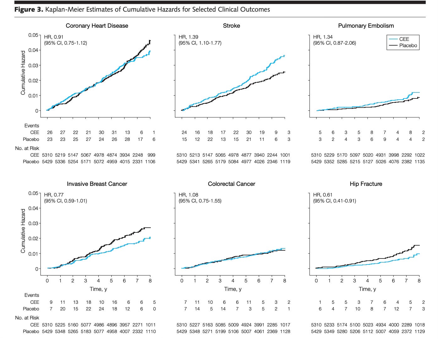 Soon thereafter, in JAMA, the broader results of the WHI were published and summarized in the graphs below. There was evidence for an increased risk of coronary heart disease, stroke, pulmonary embolism, and invasive breast cancer, and reduced risk of colon cancer and hip fracture. While the increased risk was statistically significant, the absolute risk was small: “the absolute excess risk of events included in the global index was 19 per 10,000 person-years.” For invasive breast cancer, the relative 26% increase translated to an absolute increased risk of 8 cases per 10,000 women per year.