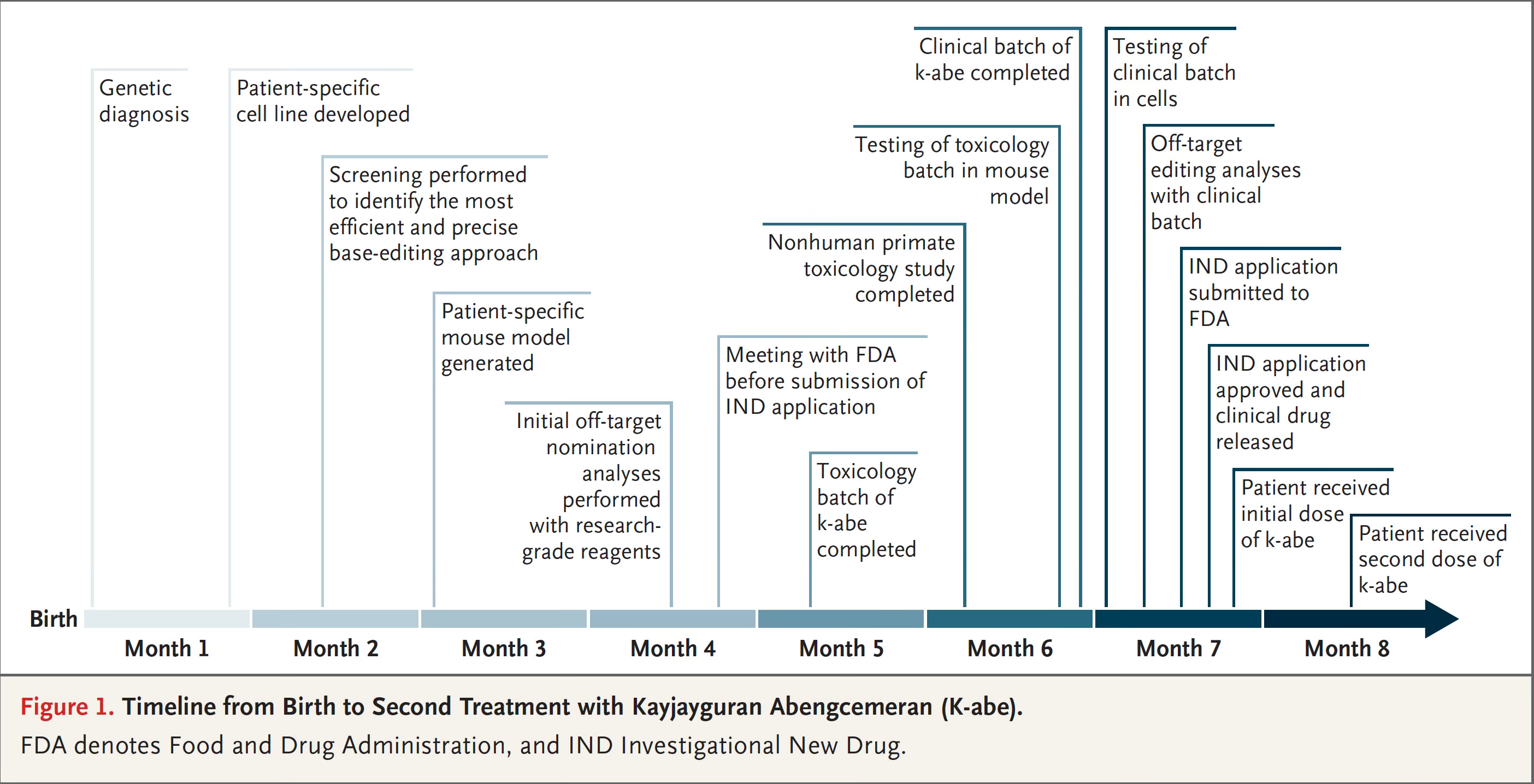 It's so amazing. I don't think people necessarily grasp this. This timeline [see above] that we'll post with this is just mind boggling how you could, as you said Jennifer, in about six months to go from the birth and sequencing through cell specific cultures with the genome mutations through multiple experimental models with non-human primates even, looking at off-target effects, through the multiple FDA reviews and then dosing, cumulatively three dosing to save this baby's life. It really just amazing. Now that is a template. And before we go to this new Center, I just wanted to also mention not just the timeline of compression, which is unimaginable and the partnership that you've had at IGI with I guess Danaher to help manufacture, which is just another part of the story. But also the fact that you're not just even with CRISPR 1.0 as being used in approvals previously for sickle cell and β-thalassemia, but now we're talking about base editing in vivo in the body using mRNA delivery. So maybe you could comment on that, Jennifer.