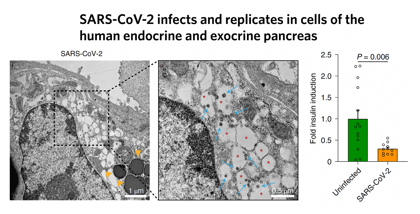 We know that SARS-CoV-2 has tropism for organs throughout the body, and the pancreatic β-islet cells, which express entry factors ACE2 and TMPRSS2, have been demonstrated to be infected by the virus in cultures of human islets and in post-mortem studies.