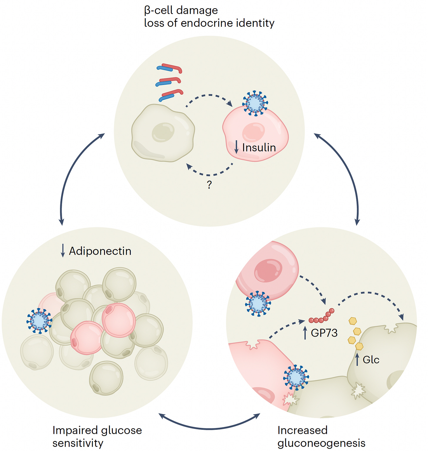 But direct infection of β-islets with cell damage or death is not requisite for developing diabetes. It can occur from inflammation of the islets or the infection may promote β-cell exhaustion. Beyond that, the role of the liver or adipose tissue in pathogenesis is unknown. When fat tissue is infected, there is less adiponectin secreted, which would confer insulin resistance, as schematically shown below.