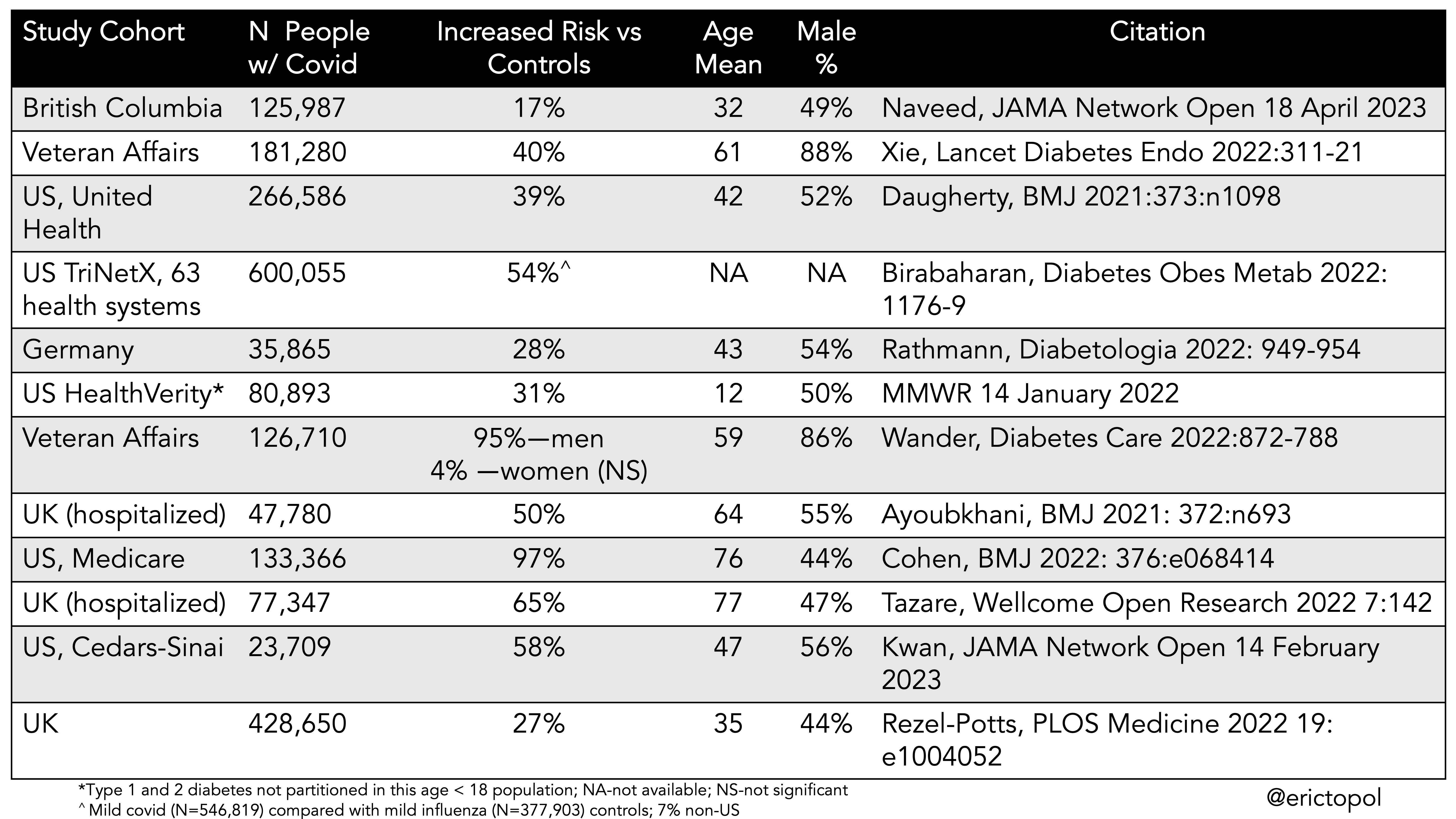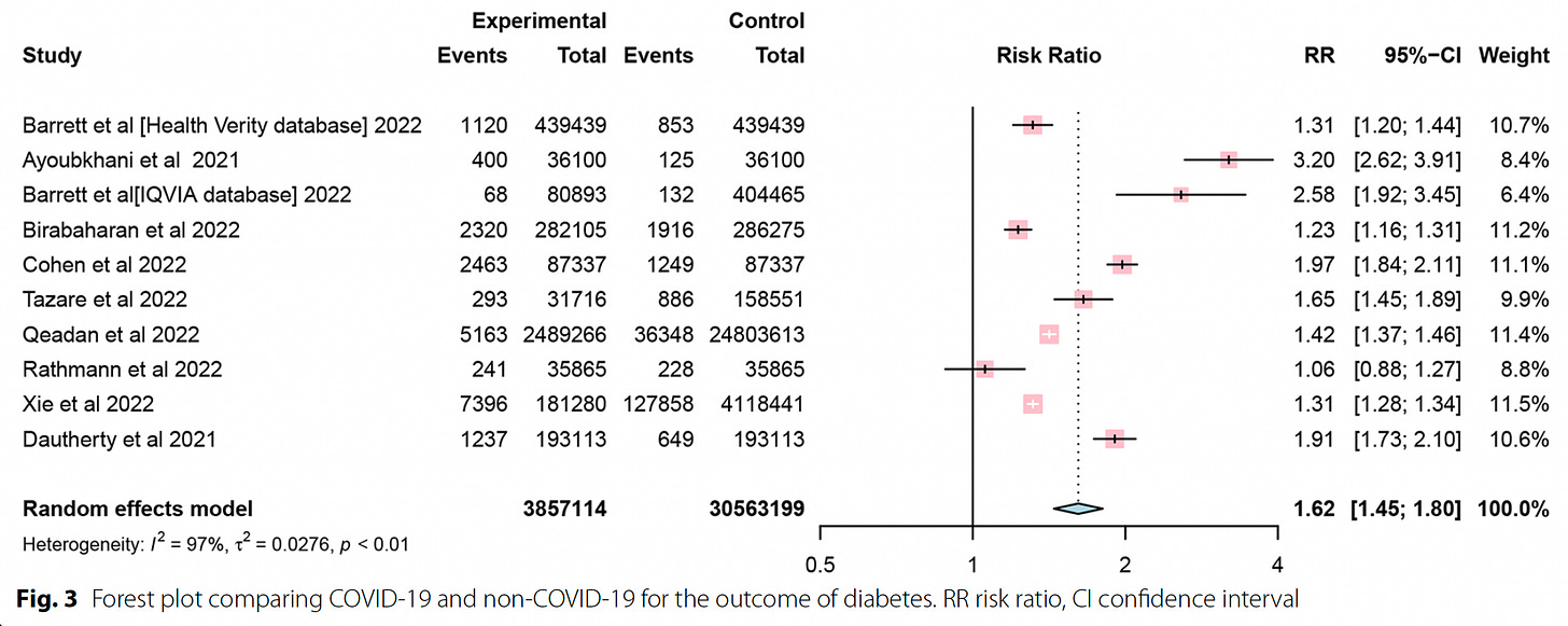 Indeed, a previous systematic analysis reported an increased risk for either Type 1 or 2 diabetes after Covid in 12 of 14 studies, ranging from 11% to 276%. That was prior to some of the newer publications included in the Table below.