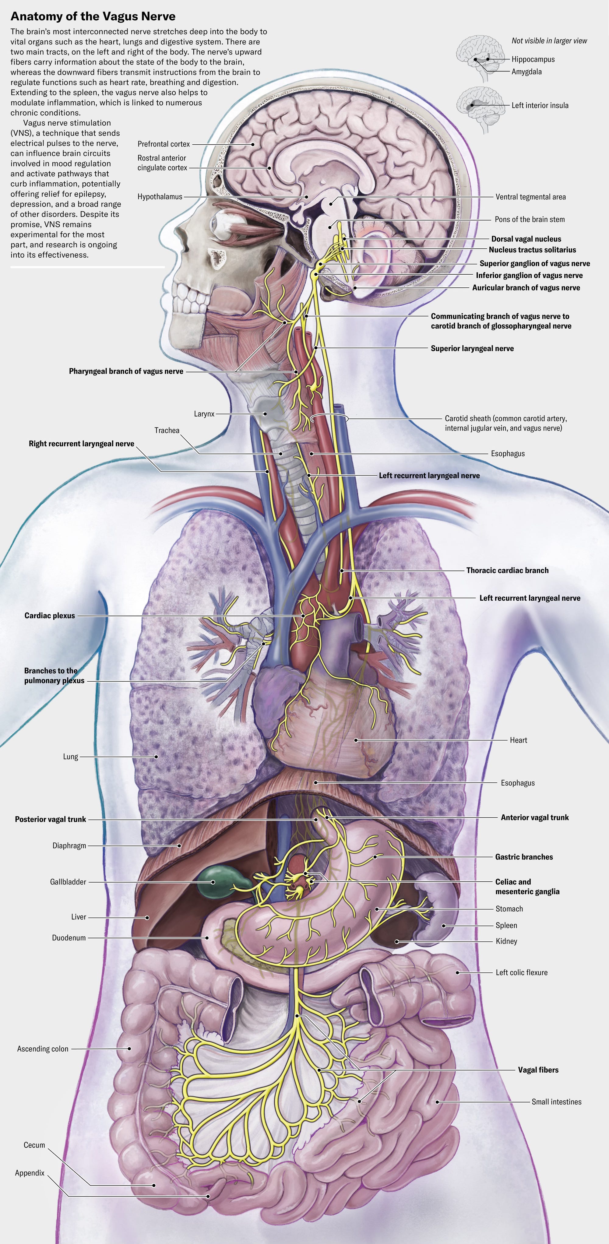 I’ve recently written about the gut-brain axis and how the gut talks to the brain and the immune system. There’s a common thread, the vagus nerve, which as shown in yellow in the map below, connects the brain with various organs throughout the body, including rich innervation of the gut lining. Beyond the vagal circuitry, other neural connections connect the spleen, gut, liver, bone marrow and lymph nodes (←new review in Nature Reviews Immunology) can activate the immune system’s T and B cells, macrophages, dendritic cells, plasma cells, production of antibodies, and release of pro-inflammatory cytokines.
