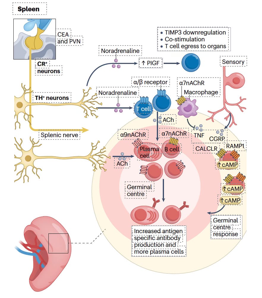 Below is an example of how the brain connects through the splenic nerve can rev up the immune system (PVN-paraventricular nucleus, AChR-acetycholine receptor, RAMP-receptor activity-modifying protein, TIMP-tissue inhibitor of metalloproteinase). The connections between the brain and immune system are not just neural mediated, but also occur via hormones and chemical signals, especially mediated via the brain’s hypothalamus-pituitary axis.