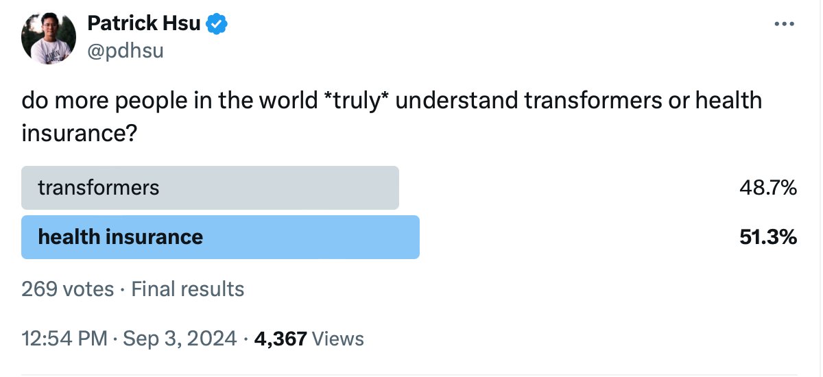 Yeah, and I think also going back to originating the question, there still is quite a debate about the creativity and the lack of any simulation of AGI, whatever that means anymore. And so, the human in the loop part of this is obviously I think it's still of critical nature. Now, the other thing I learned about you is you have a great sense of humor, which is really important by the way. And recently, which is great that you're active on X or Twitter because that's one way we get to see what you're thinking on a day-to-day basis. But I think you put out a poll which was really quite provocative , and it was about, here's what it said, “do more people in the world *truly* understand transformers or health insurance?” And interestingly, you got 49% for transformers at 51% for health insurance. Can you tell us what you're thinking when you put that poll together? Because obviously a lot of people don't understand either of these.