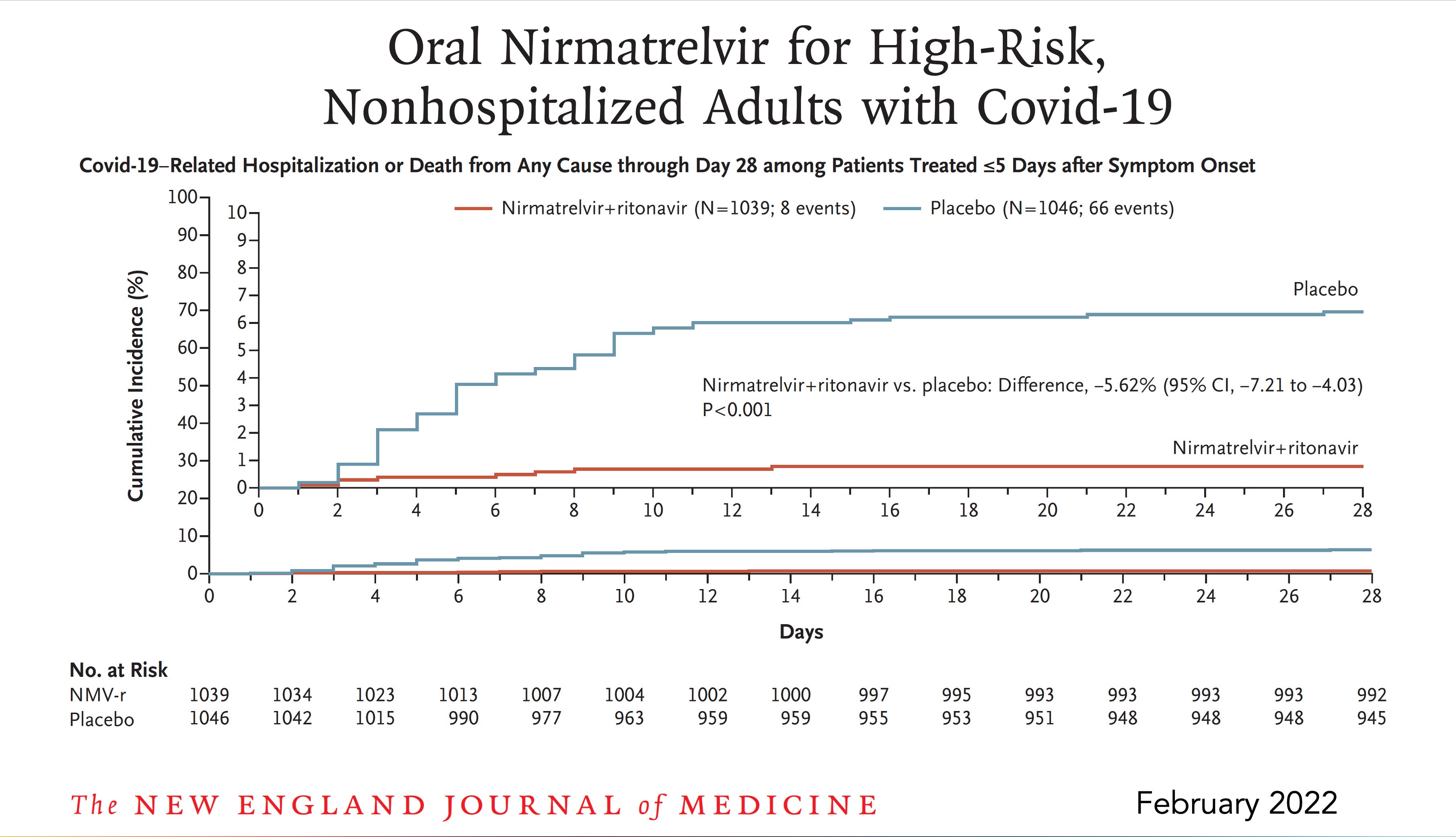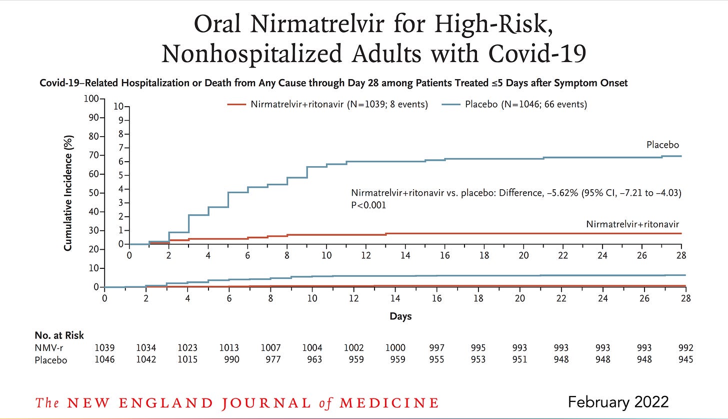 Last December I wrote a piece here on Paxlovid, “a just-in-time breakthrough” that went through the mechanism of the drug, the results of the randomized, placebo-controlled clinical trial in high-risk individuals subsequently published in the New England Journal of Medicine (below), and why, because its effect was independent of new variants, that the timing of its documented high efficacy (just when Omicron hit) was ideal. An 89% reduction of hospitalizations and deaths by day 28 (absolute reduction of 6.2/100) was impressive, along with the finding of 0 deaths in the Paxlovid group (7 in the placebo arm). Viral load was rapidly and significantly reduced with treatment. There were less side effects in the Paxlovid than placebo arm.