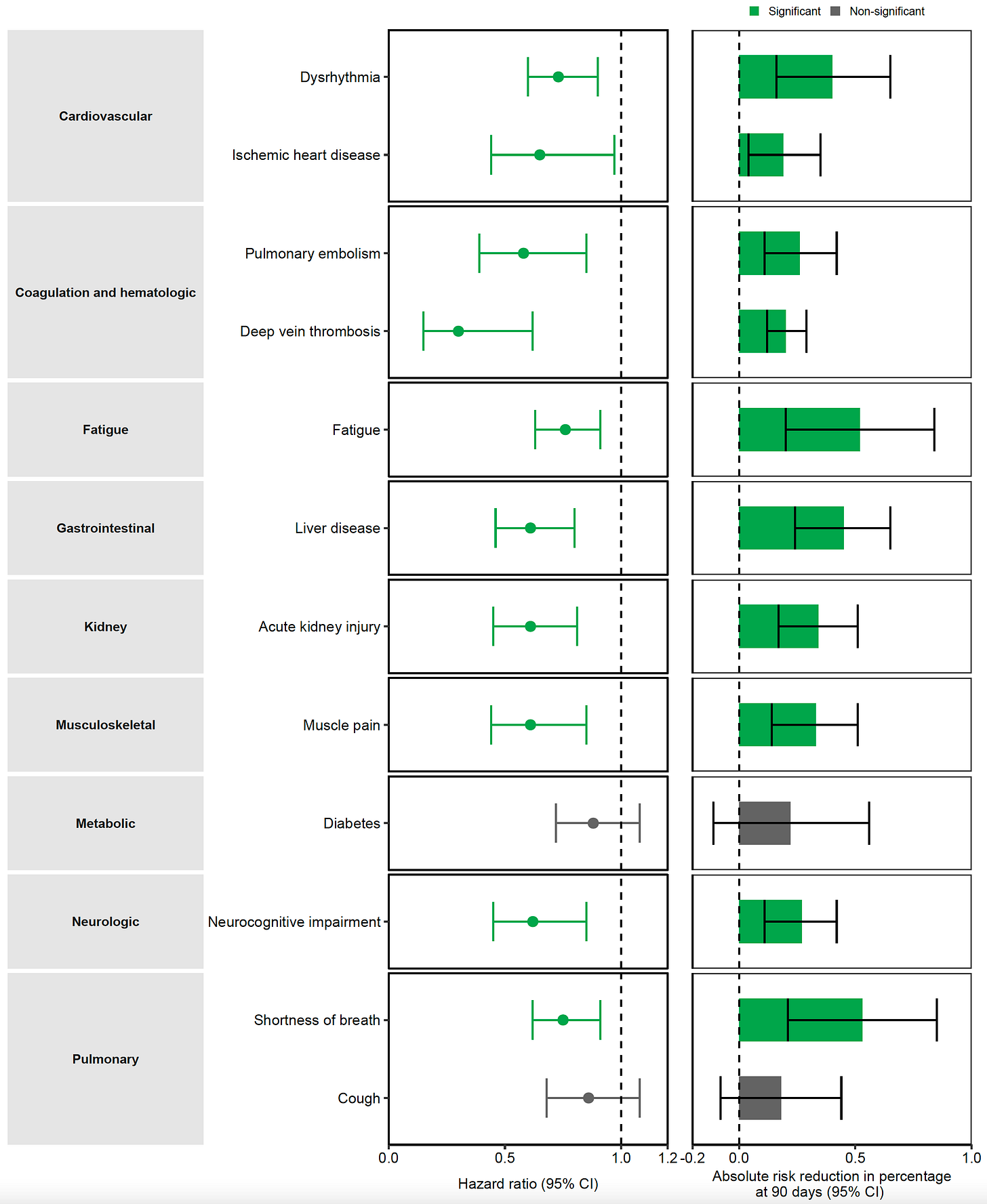 That was broken down into 12 components (by systems and symptoms) and all but 2 were significantly reduced by Paxlovid. The relative reduction is on the left, the absolute reduction at right.