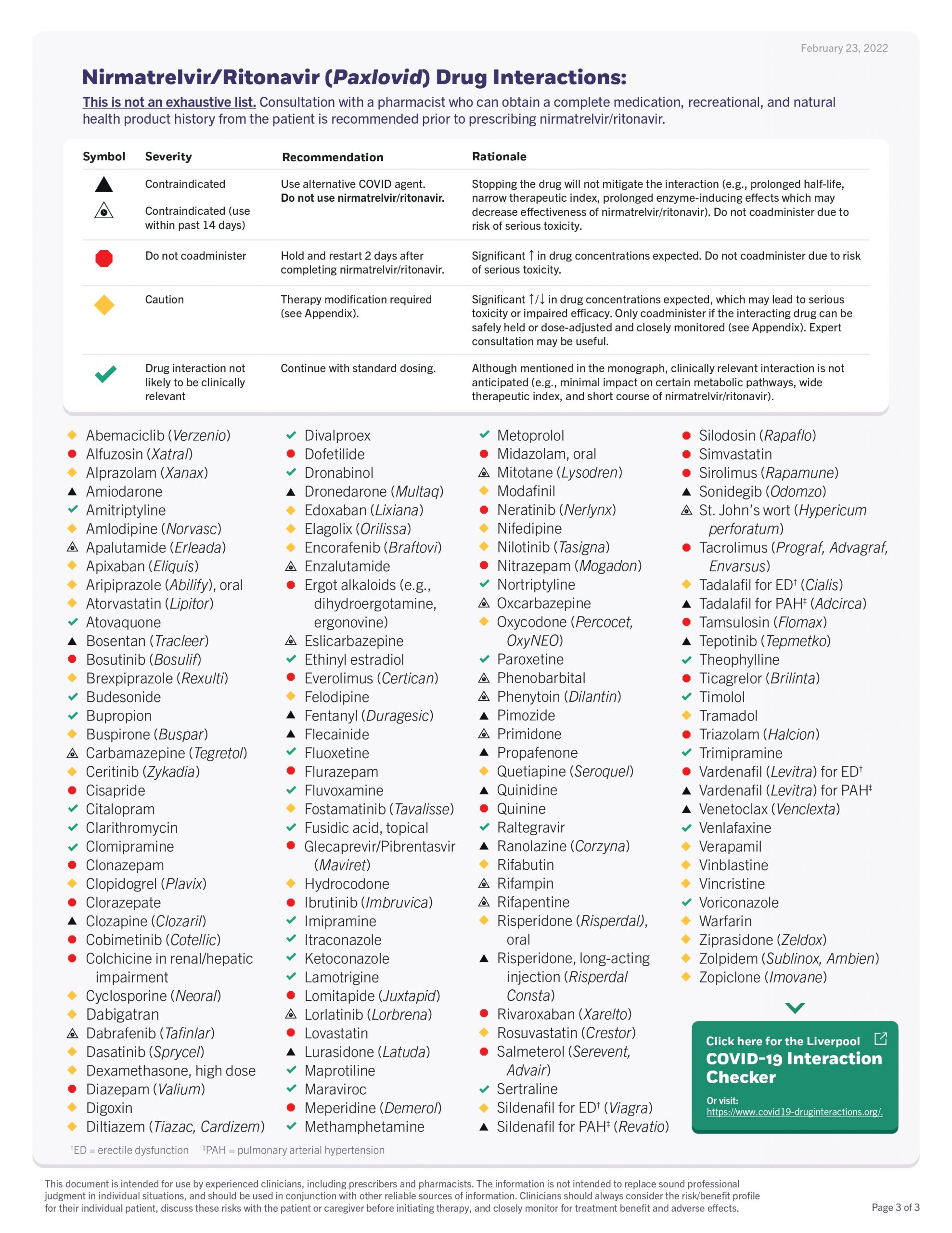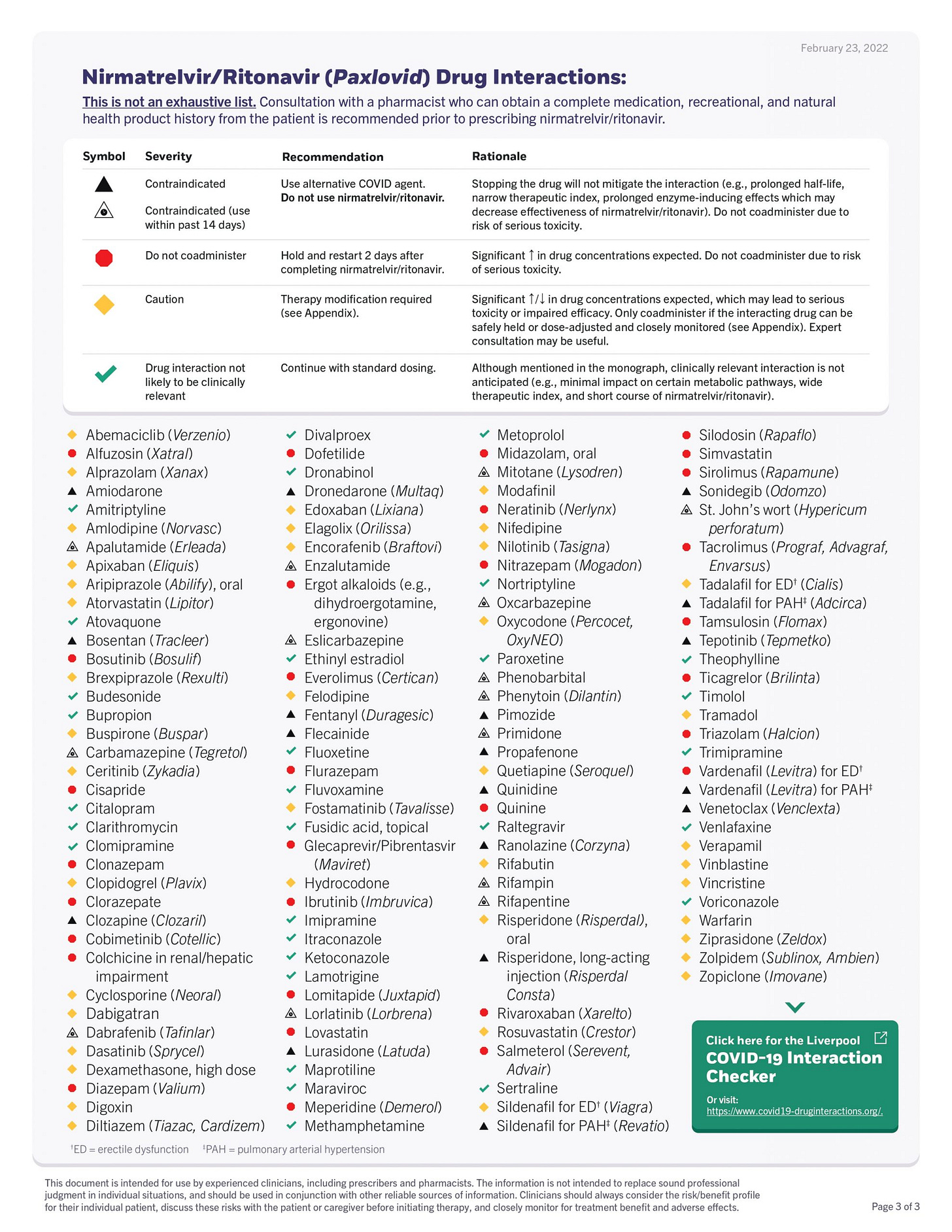 There are many Paxlovid drug-interaction checkers, but the one I find most useful is from the University of Liverpool summarized in the Table below. As you’ll see there are very few concurrent medications that are contraindicated (black triangle). For most, the interactions can be avoided by holding the medication of concern until the 5-day treatment course is completed.