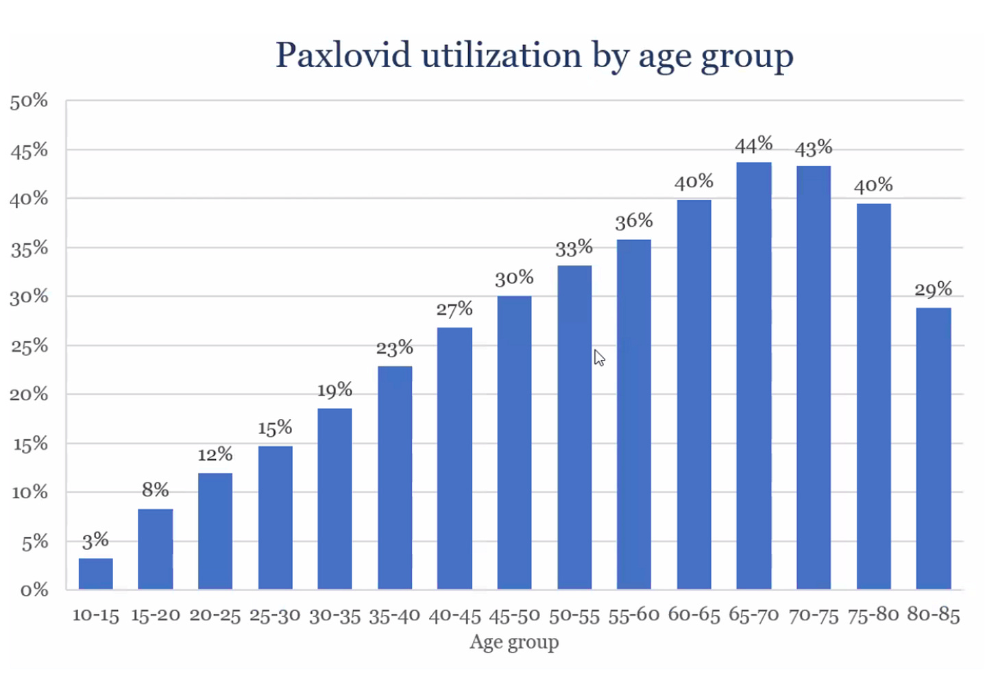 In the United States, there is a marked decline the use of Paxlovid for people age 70+. As seen in this graph, a person age 45-50 is as likely to get treated as one 80+. The reasons for that are not entirely clear, but concerns about interactions with medications is likely high on the list. Nearly all of the interactions can be safely avoided by stopping the medication for the brief 5-day period of paxlovid treatment.