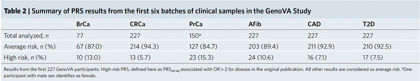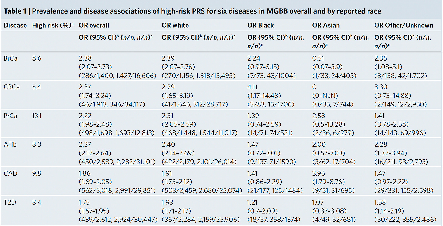 But these companies are not using multi-ancestry, state-of-the-science PRS adjusted risk scores, like what has been reported today. Their data are not transparent for thresholds and validation. Following the post, 23anMe pointed me to a white paper on their methodology and that their threshold for a high PRS (“increase likelihood”) is an odds ratio > 1.5.