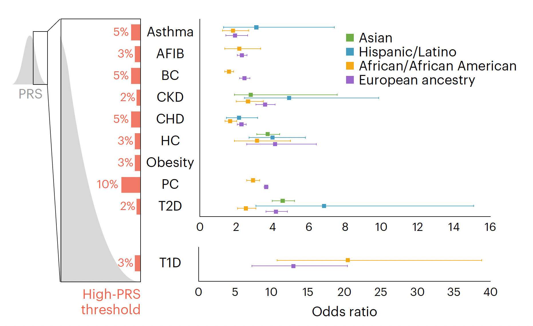 Last year, the Mass General Brigham health system started a plan for implementing PRS for their patient population for 6 conditions, all but 1 (colon cancer) overlapping with the new report. The thresholds for high-risk were somewhat different and their results broken down by ancestry into three groups below.