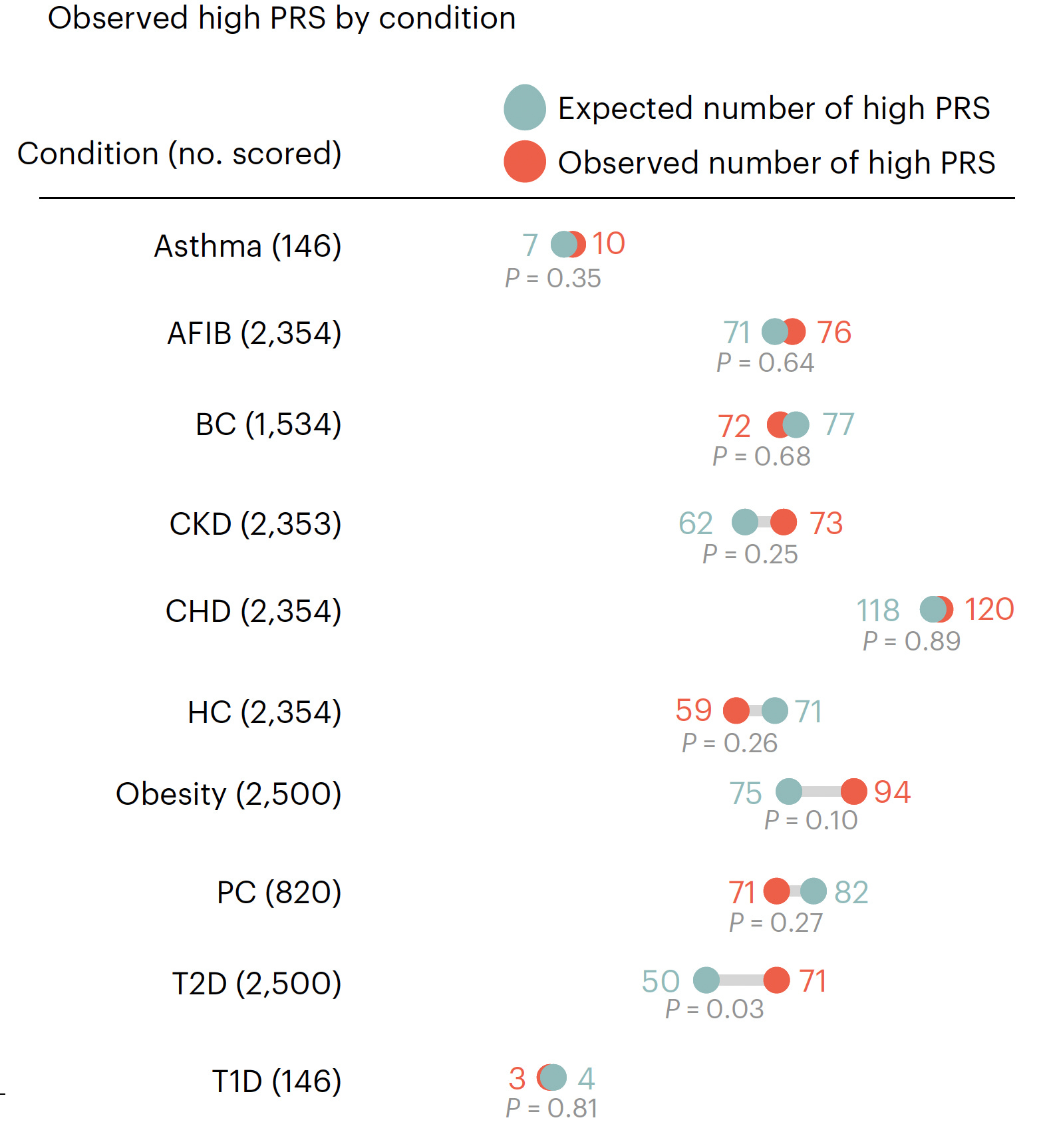 As assessed in the first 2,500 people prospectively, 20.6% had at least 1 high-risk PRS, 2.6% had 2 PRSs that were high-risk, and only 2 individuals had 3 high-risk PRSs. The number found to have a high-risk PRS (both expected and observed, no significant differences except for T2D) for each of the 10 conditions is shown below. High-risk for coronary heart disease (CHD) had the highest yield