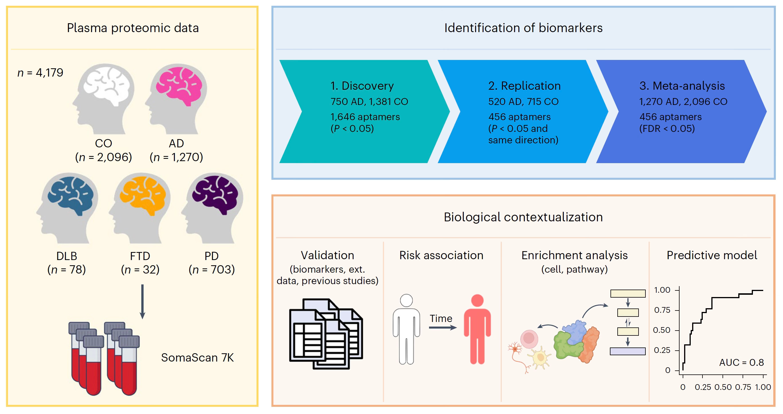 A new paper in Nature Aging assessed nearly 7,000 unique plasma proteins (Somascan, see prior Ground Truths on high-throughput plasma proteins and A.I.) in ~1,300 participants with Alzheimer’s and ~2,100 who were cognitively intact. The analysis using machine learning identified several proteins that predicted clinical AD and biomarker AD status.