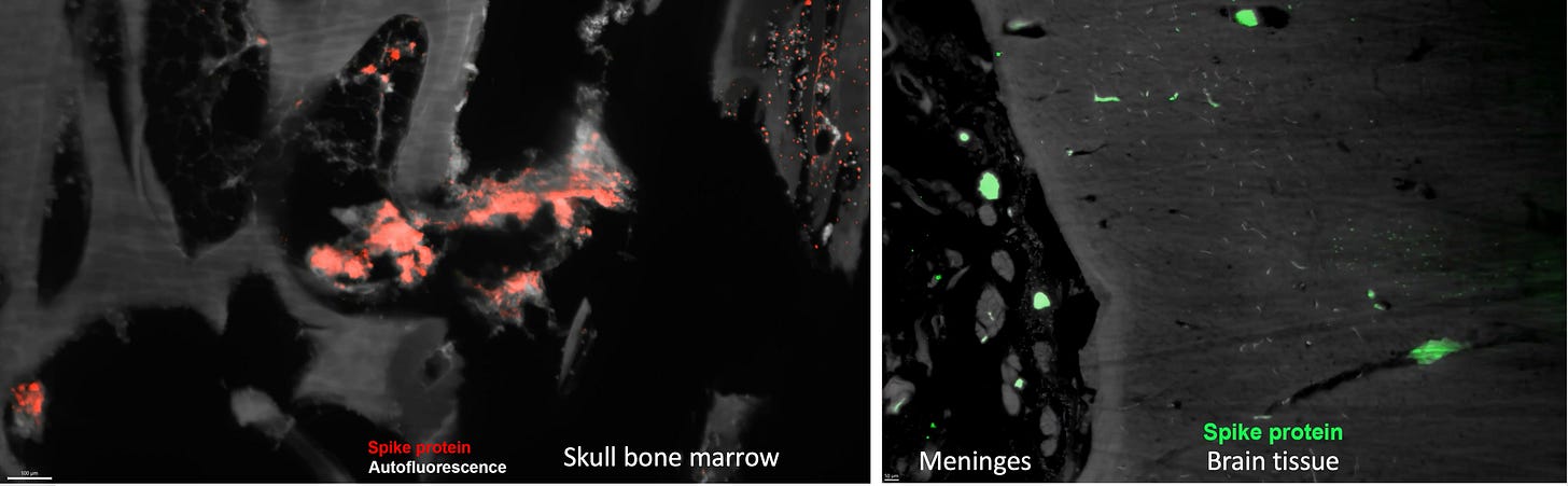 —The brain’s immune system (the skull bone marrow-meninges axis niche reservoir) and “enormous amounts” of the SARS-CoV-2 spike protein localized to the skull bone marrow, meninges and brain tissue in people who had Covid but died of other reasons, fully discussed here