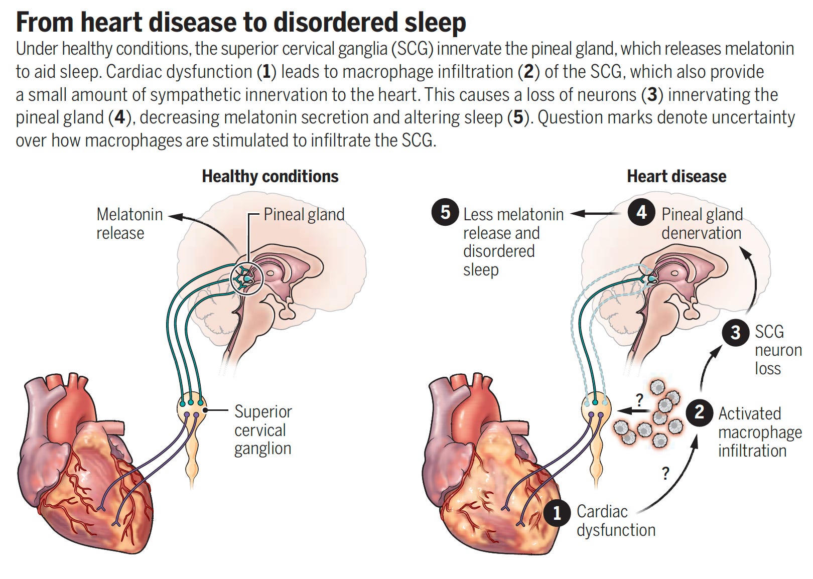 —The superior cervical ganglia (SCG) and pineal gland loss of innervation (immune-mediated) leads to sleep disturbance in people with heart failure