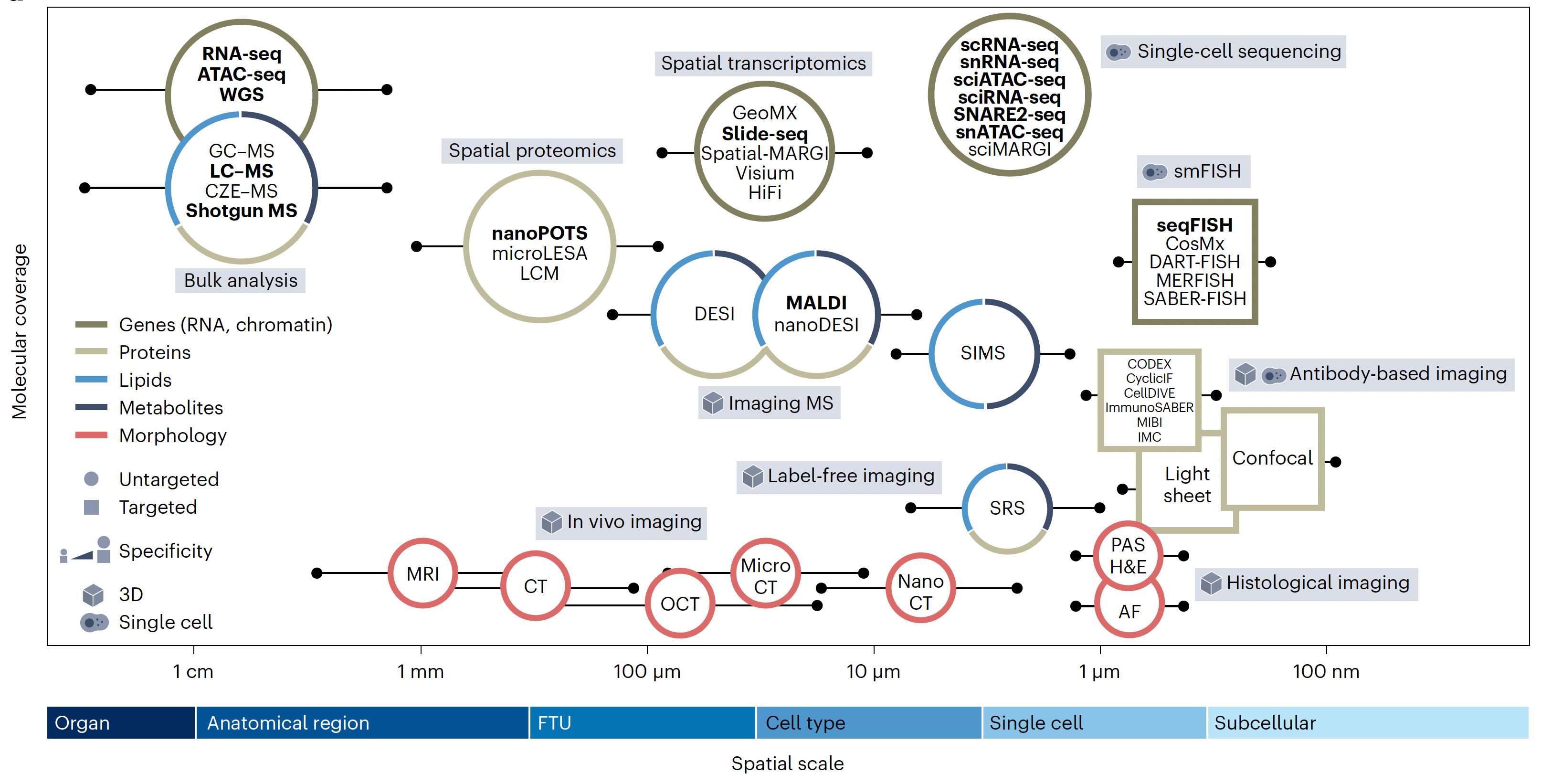 This is seen in the graph below (from Jain et al) with the many types of single cell or single nuclei sequencing that can be performed across the spatial scale (x-axis), the multiplex mapping of the cell’s in situ constituents. Intact, label-free (leveraging A.I.) and in vivo imaging can be obtained through different techniques, along with histology or antibody-based imaging that complements the omic sequencing for deep characterization. Talk about scale: in several studies of cancer spatiotemporal evolution, more than 1.1 to >1.6 million cells were mapped by at least some of these methods!