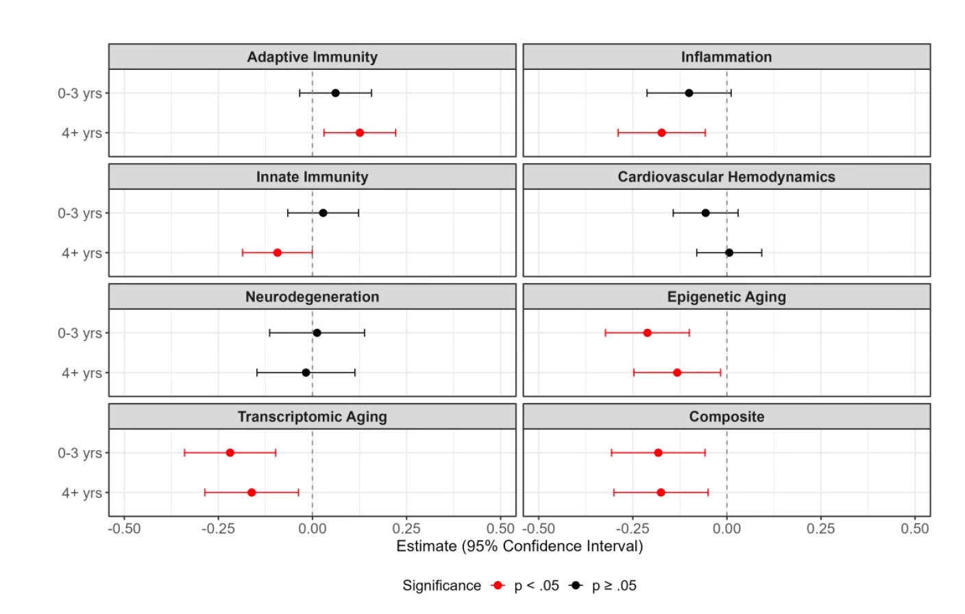 As you can see below, the regression coefficients with 95% confidence intervals (the correlation) for having the shingles vaccine were associated with significantly more inflammation and slower epigenetic aging. Also a higher level of adaptive immunity was linked with the vaccine.