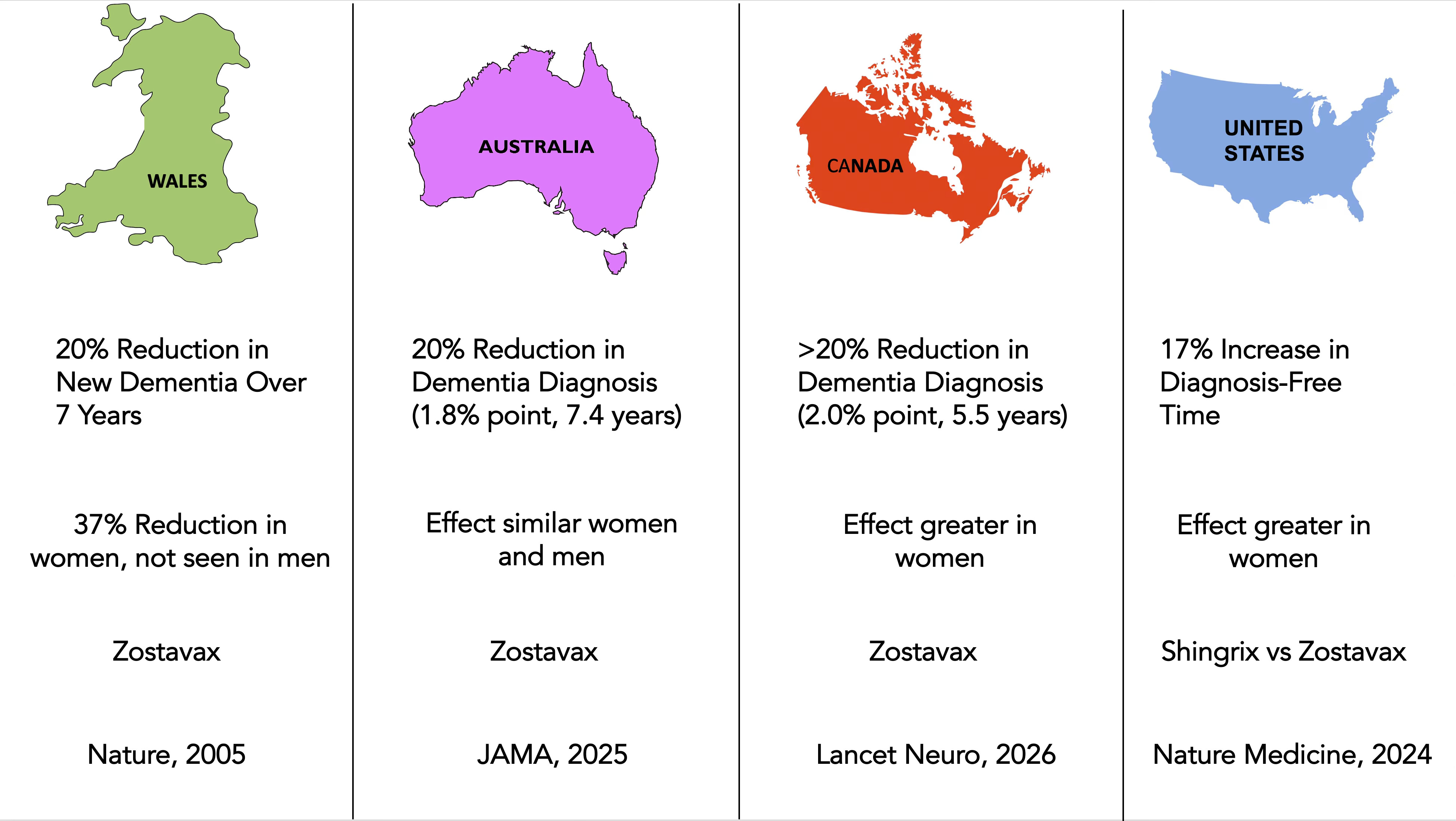 Previously, there were natural experiments published for the country of Wales by Eyting et al (N=280,000), Australia by Pomirchy and colleagues (N-101,219), and a US comparison of the live attenuated vs recombinant (Shingrix) vaccine by Taquet et al (N=103,615). The numbers in parentheses refer to the number of people assessed, each analysis enabled by birthdate cutoffs. The reports from Wales, Australia and Canada all used the Zostavax (old) Shingles vaccine whereas the US study assessed the difference between recombinant Shingrix vs Zostavax with the main finding of a 17% increase in dementia-free time. All 4 of the reports included an in-depth analysis of potential confounders, showing, as you would expect, minimal differences between groups vaccinated or unvaccinated.