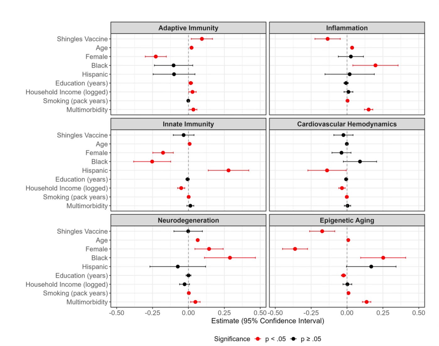 In the Journal of Gerontology, Jung Ki Kim and colleagues from the University of Southern California, published a novel study of 3,884 participants, part of the US Health and Retirement study cohort, age 70+ (in 2016) for 7 domains of biology. Half (49.6%) had a Shingles vaccine. The 7 domains were: 1. adaptive immunity (biomarkers of B and T cells and their subtypes); 2. innate immunity (natural killer cells, other white blood cells besides lymphocytes); 3. Inflammation (IL-6, C-reactive protein, and 7 other blood inflammation markers); 4. epigenetic aging (PhenoAge, GrimAge, DundedinPACE); 5. Transcriptomic aging (transcriptomic mortality-risk age); 6. neurodegeneration biomarkers (p-tau181, GFAP, NFL, and Aβ42/40 Ratio; and 7. simple cardiovascular metrics (blood pressure, heart rate). A composite score was also derived for all domains except adaptive immunity. Not all participants had all the domains assessed but the minimum number for an assay domain was about 1,500 participants.