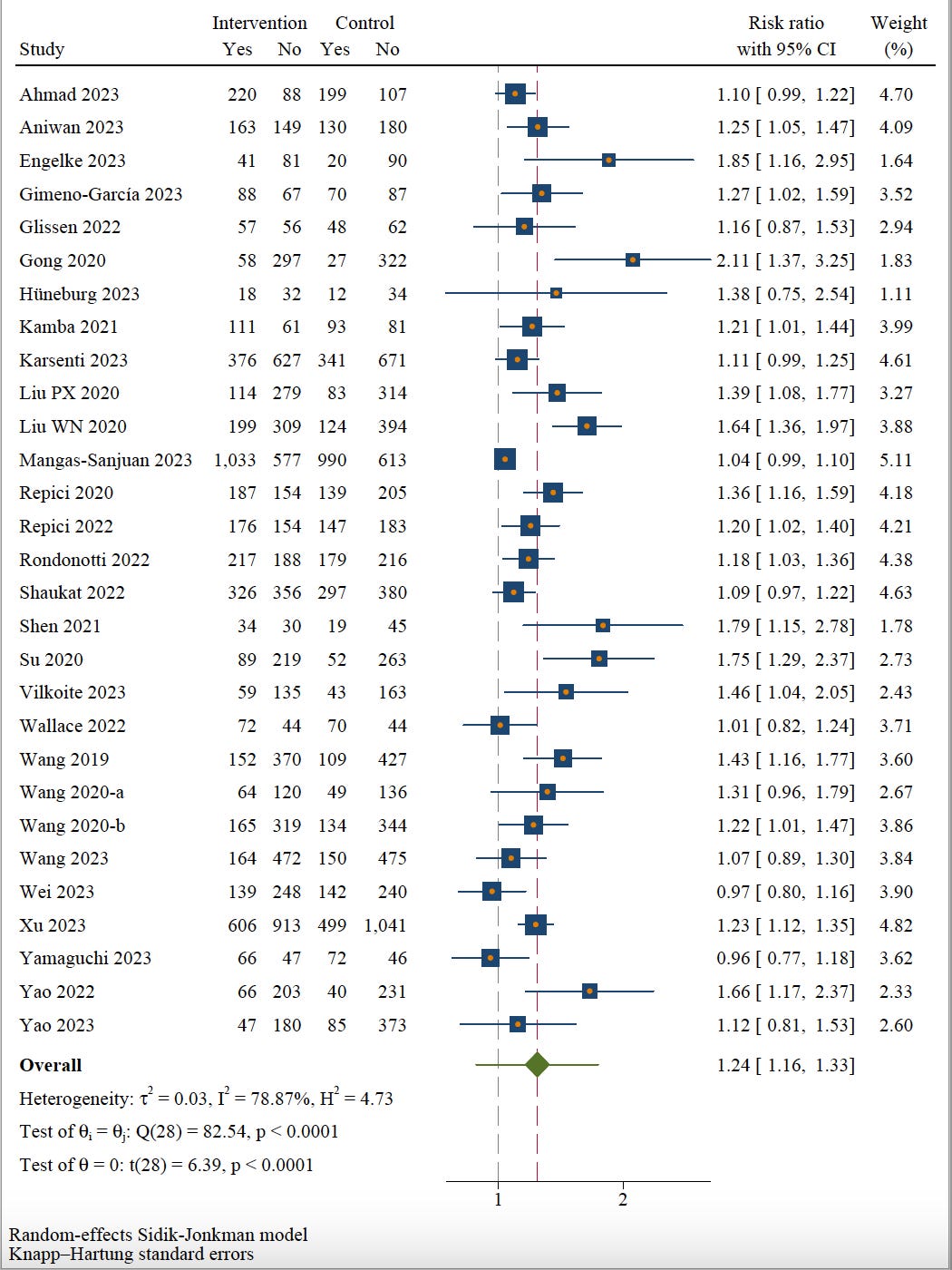 Across these 33 trials, which represent the largest proportion of randomized trials performed thus far in medical A.I, there was an impressive increased A.I. boost in detection of adenomatous polyps, the ones that are most likely to progress to cancer. As seen in one of the many graphs from the paper, there was a pretty consistent benefit across the trials (nearly all the boxes in the Forest plot are to the right of the vertical line of 1).