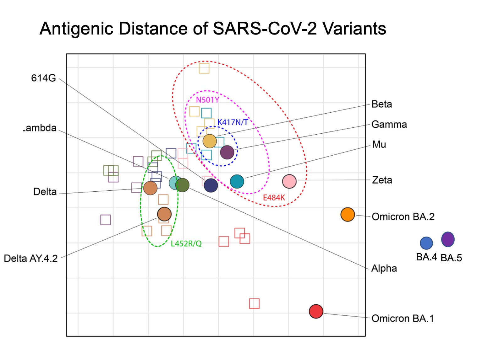 Then there’s the antigenic map, that tells us about the virus’s spike protein and how our immune system “sees” it. BA.4, which has a very similar spike protein sequence to BA.5 (vida infra), have not been mapped by this report, but theoretically they’d be off the chart as I’ve shown here. You can see that the antigenic distance from BA.1 to BA.2 is far greater than the ancestral strain to Delta or Beta or Gamma. This is the basis for the immune escape of BA.5—our relatively poor recognition of and response to the spike protein.