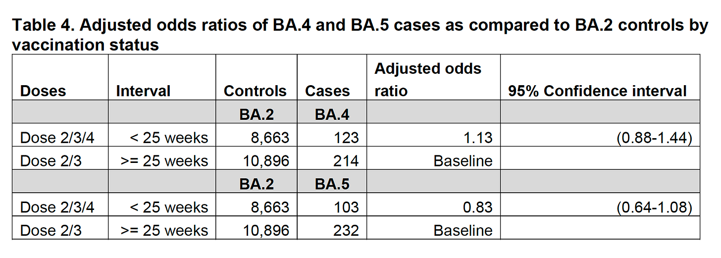 Do the current vaccines work against BA.5? The new UKHSA report started to address this question, looking at symptomatic infections and severe disease, but it’s unclear. With the extent of BA.5’s immune evasion and the recent trends of lowered vaccine effectiveness vs severe disease (from 95% vs Delta with a booster to ~80% vs Omicron BA.1 or BA.2 with a booster) it would not be at all surprising to me to see further decline of protection against hospitalizations and deaths.