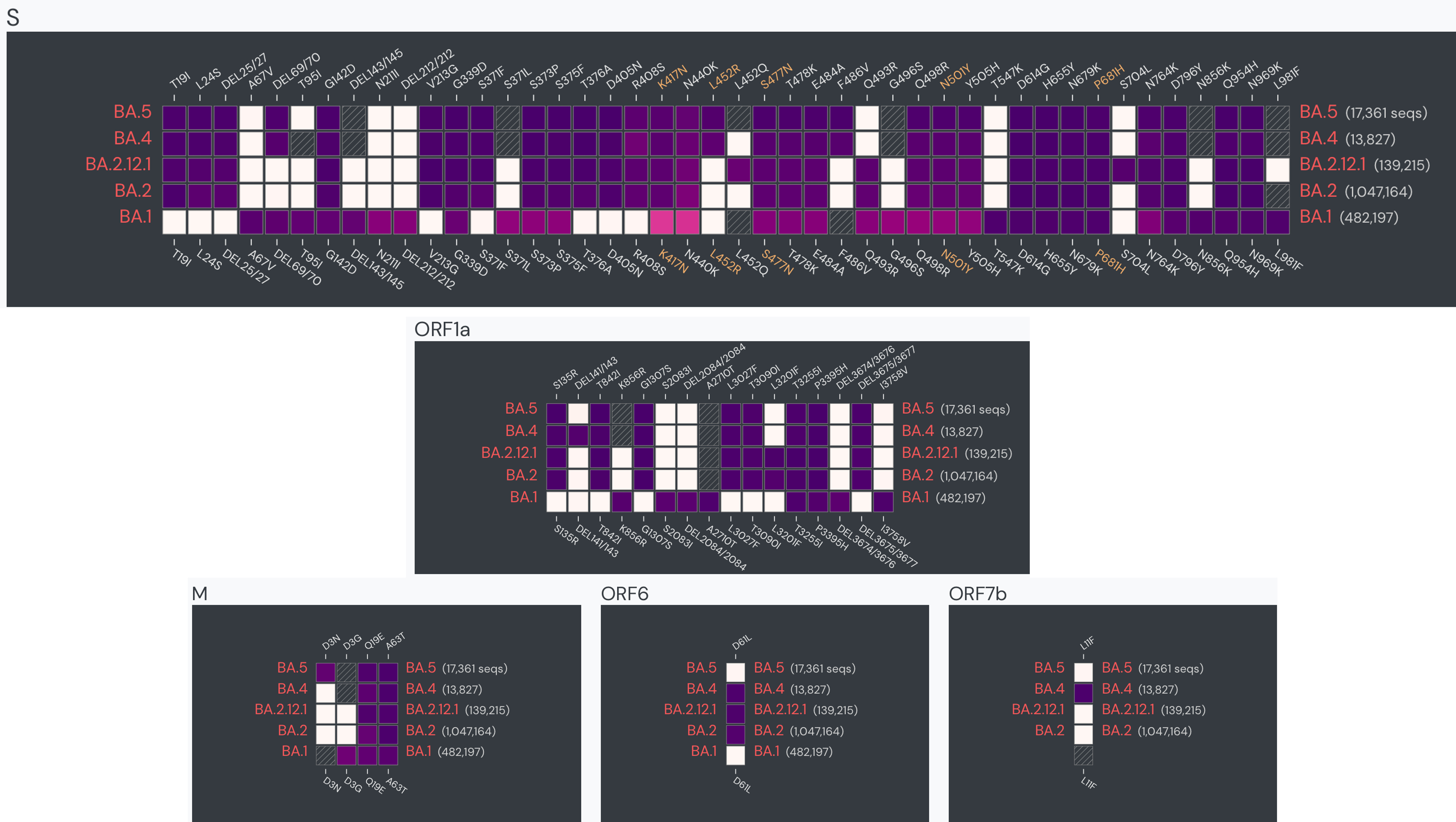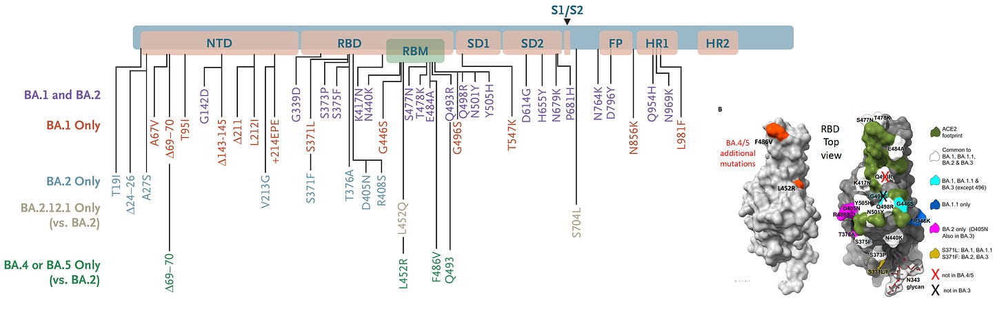 Since we’re basically spike-centric, which discounts the potential of non-spike mutations (which are likely important for understanding BA.4 vs BA.5), here are the key sequence differences compared with BA.2 and the other Omicron variants