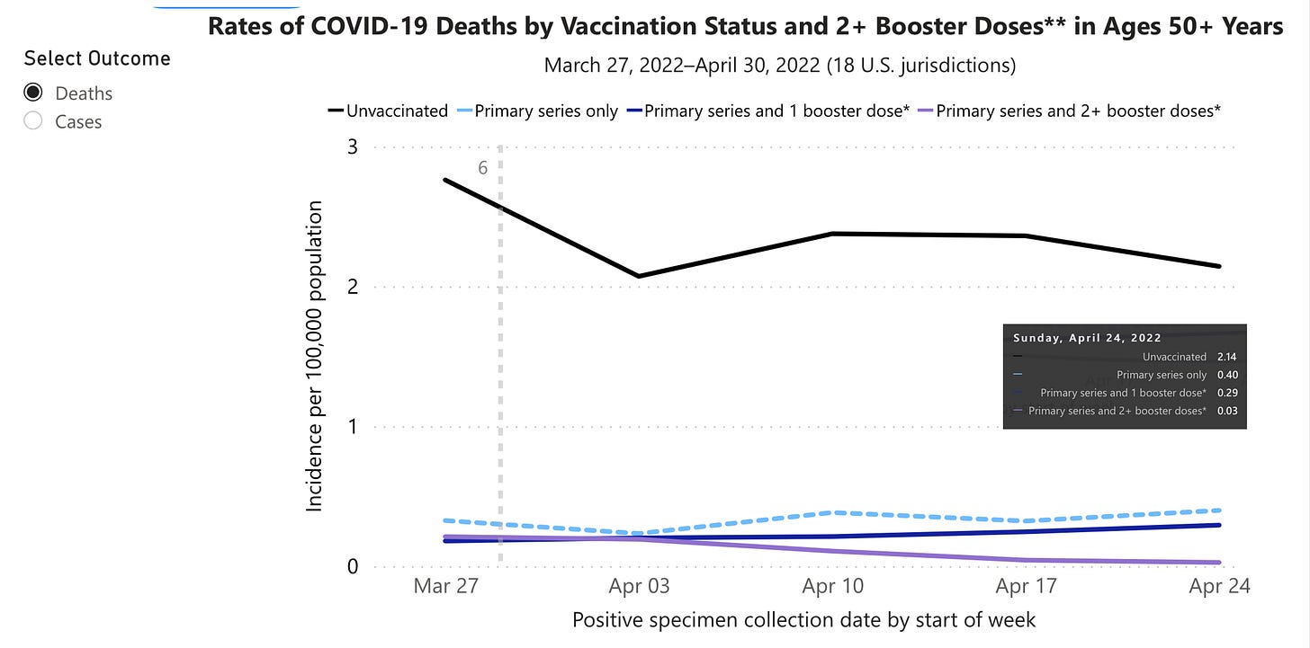 Obviously, the non-pharmacologic mitigating measures that include high-quality make (N95/KN95), physical distancing, ventilation and air filtration would help, but pandemic fatigue has led to very low level of adoption. Boosters would help, and it is noteworthy that for people age 50+ there is a substantial (14-fold) reduction for mortality as recently documented by the CDC for a 4th shot (previously published by the Israel investigators in multiple observational studies). That is 99% reduction in mortality for 4-shots vs 86% for 3 shots. But only 1 in 4 Americans age 50+ have had a fourth shot!