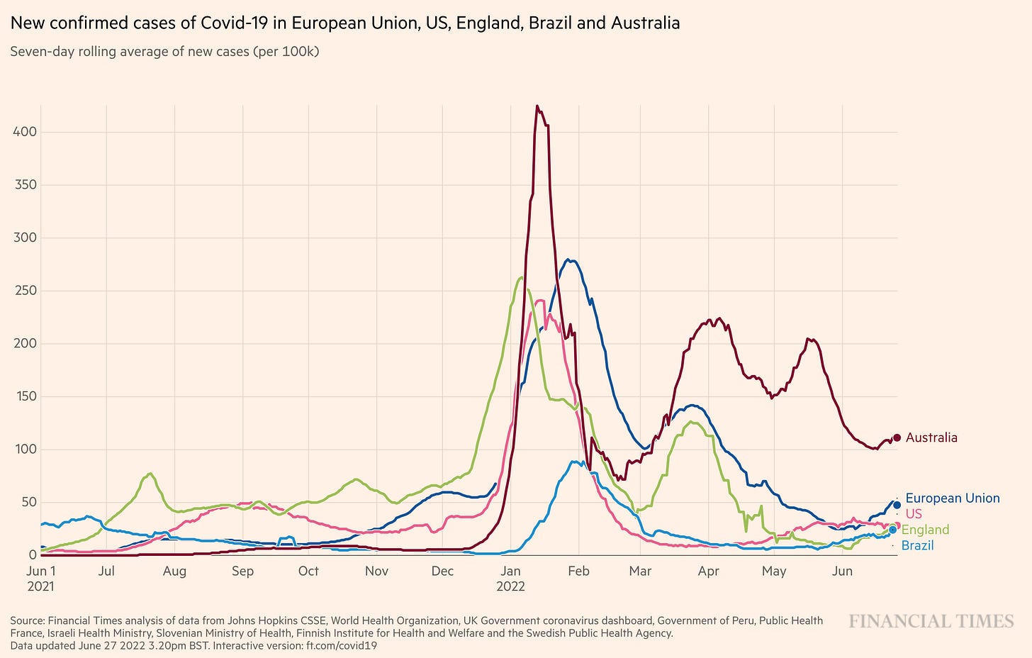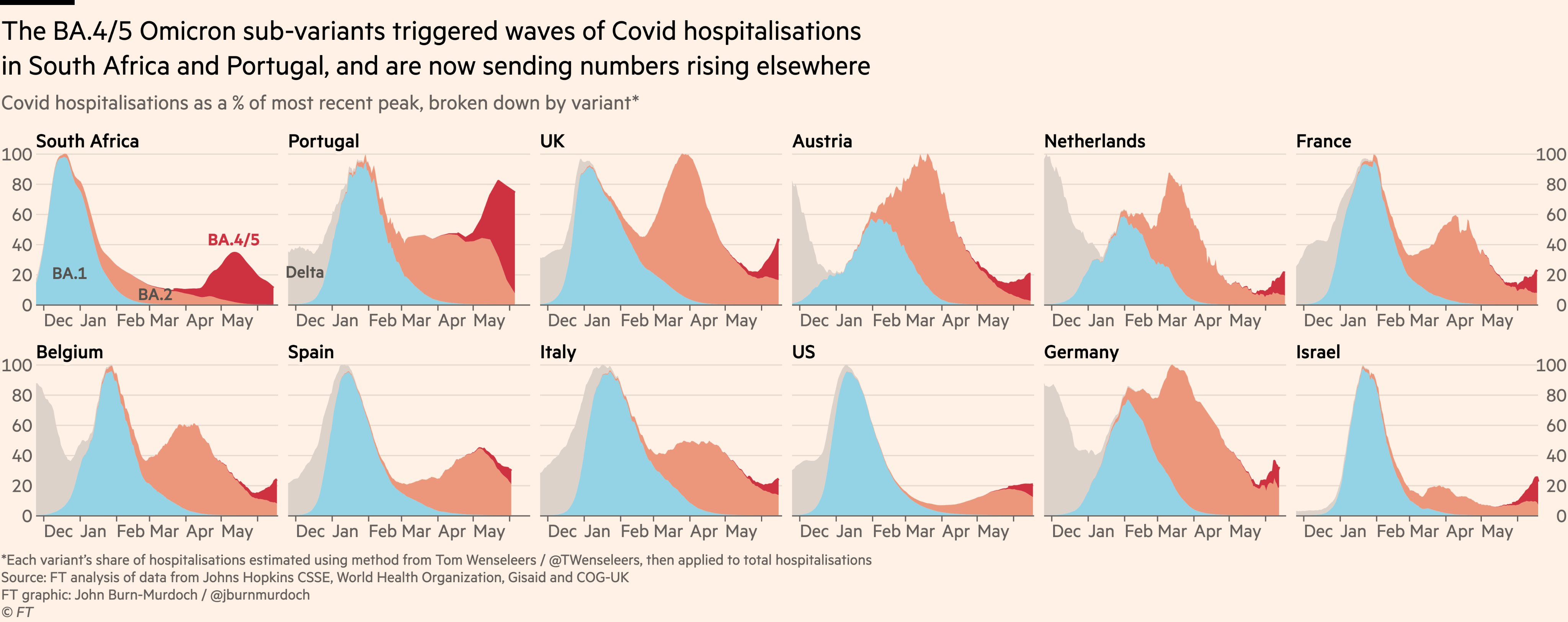 While initially seen in South Africa soon thereafter in Portugal, BA.5 has been detected throughout the world. It led to a marked rise in hospitalizations in Portugal where it rapidly became dominant, and is now having such an effect, to a variable extent, in many European countries and Israel. It is frequently masked since the rise of BA.5 is occurring at the same time as the decline in BA.2 in several countries, and the magnitude of the BA.2 wave was different between countries.