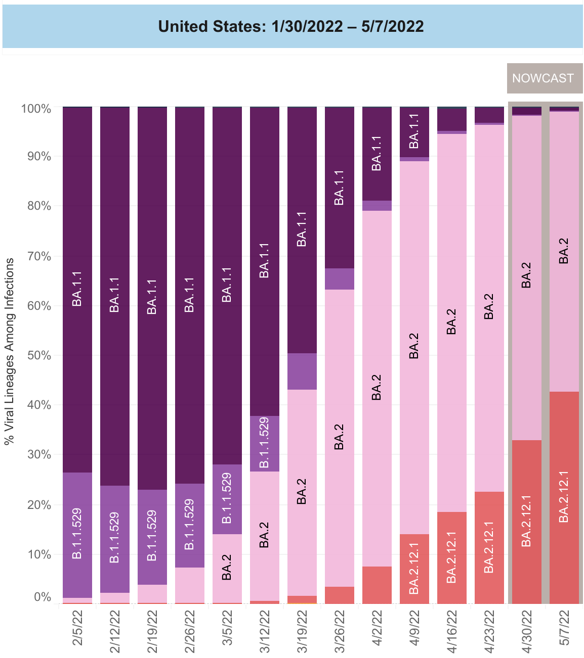 As of last week, 43% of new cases were attributable to BA.2.12.1 and this subvariant had reached dominance (>50% of cases) in only one region of the country. BA.2.12.1 is out-competing BA.2 with its 25% higher transmission rate, which foretells its further rise to dominance across the US in the days and weeks ahead.