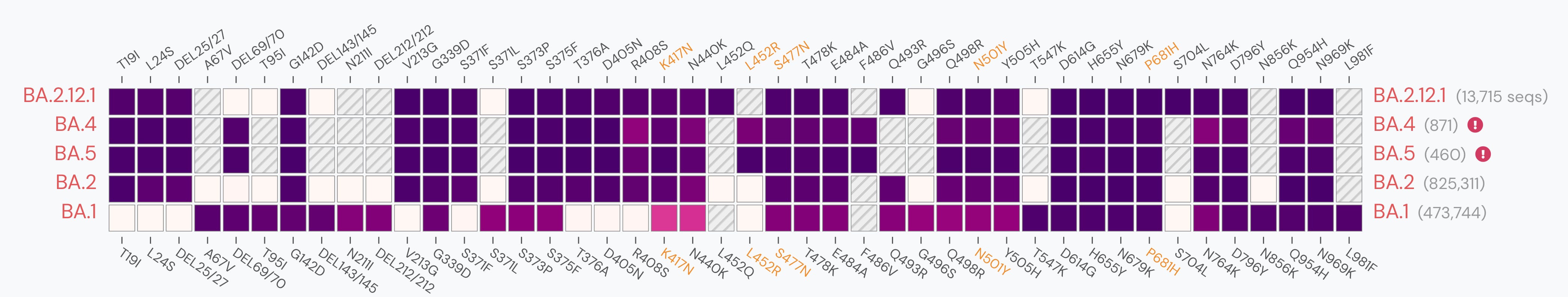 BA.2.12.1 is quite distinct from Omicron BA.1 and BA.2. As you can see on this mutation map of the spike, which is just one part of the virus sequence, albeit a critical one, there is a key, unique mutation L452Q. The other important Omicron subvariants currently, BA.4 and BA.5, have multiple different mutations (including L452R, F486V and R493Q) from BA.2, and account for the new wave of cases in South Africa, and more recently in Portugal, and have just been labelled as VoC (variants of concern) by the European Centre for Disease Prevention and Control. Both BA.2.12.1 and BA.4/BA.5 pose a further challenge to our immune system recognition, with minimal cross-immunity derived from BA.1. That is especially noteworthy since 40-50% of Americans were infected with BA.1 (or BA.1.1) and without added protection from vaccination, they will be vulnerable to BA.2.12.1 infections. It is further worth mentioning that the Omicron-specific booster vaccines in the hopper, thought to be due out in July, are BA.1 directed and may not provide strong protection against BA.2.12.1 or whatever new Omicron subvariant (or not Omicron related) we will be dealing with this summer. It remains to be seen whether BA.4/BA.5 can outcompete BA.2.12.1, with the former now at low levels in the US.
