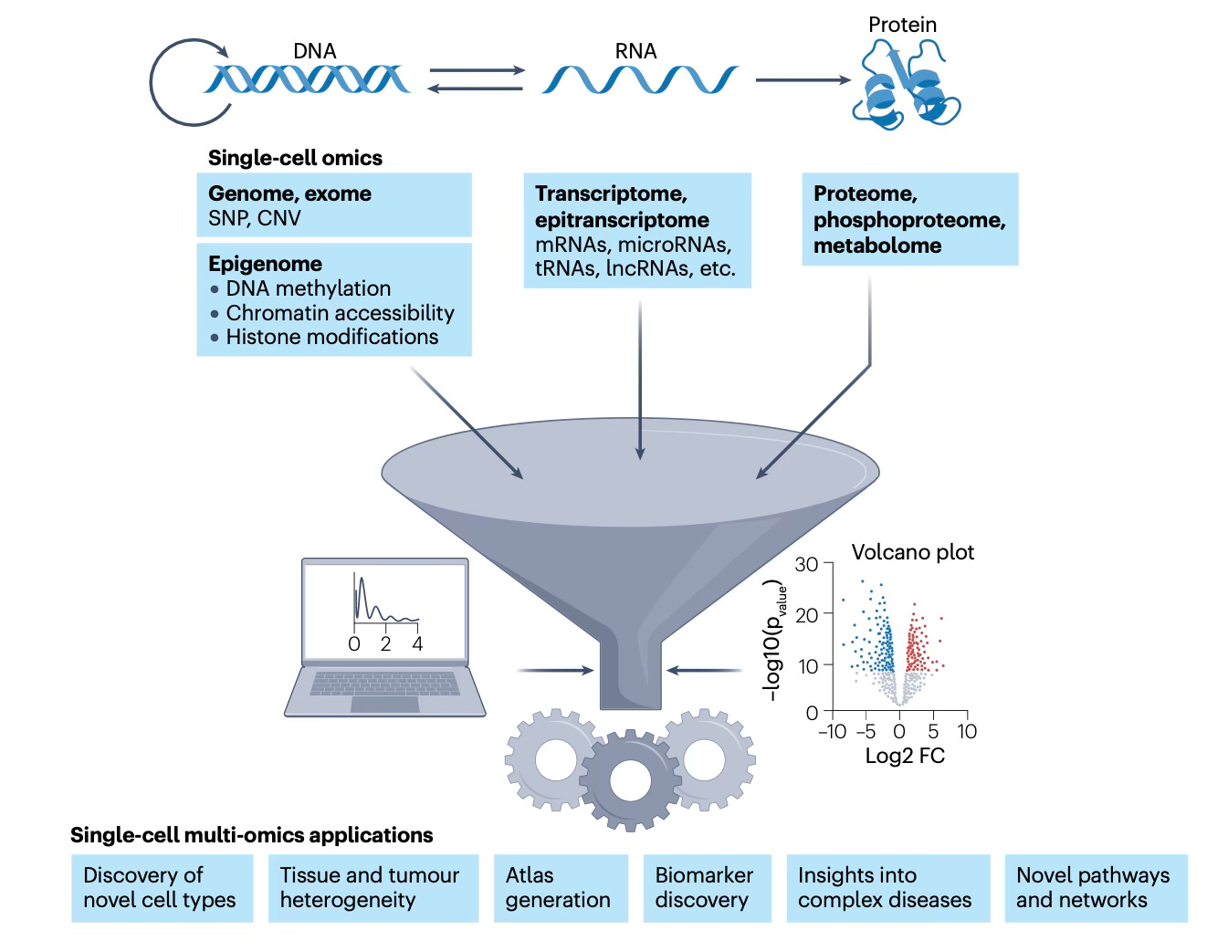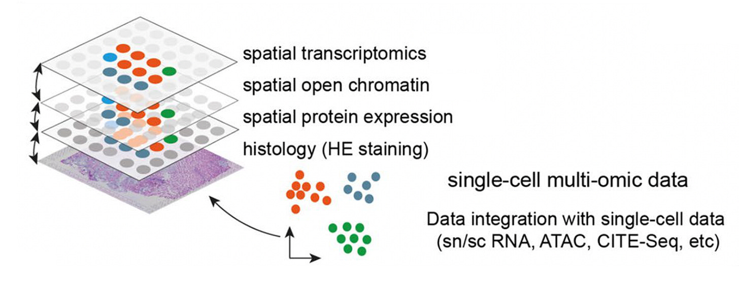 Below is a simplified graphic to show single-cell (SC, or single nuclei, SN) spatial multi-omics from a slide, with the data from each modality superimposed and integrated. Figure adopted from Kiessling and Kuppe.