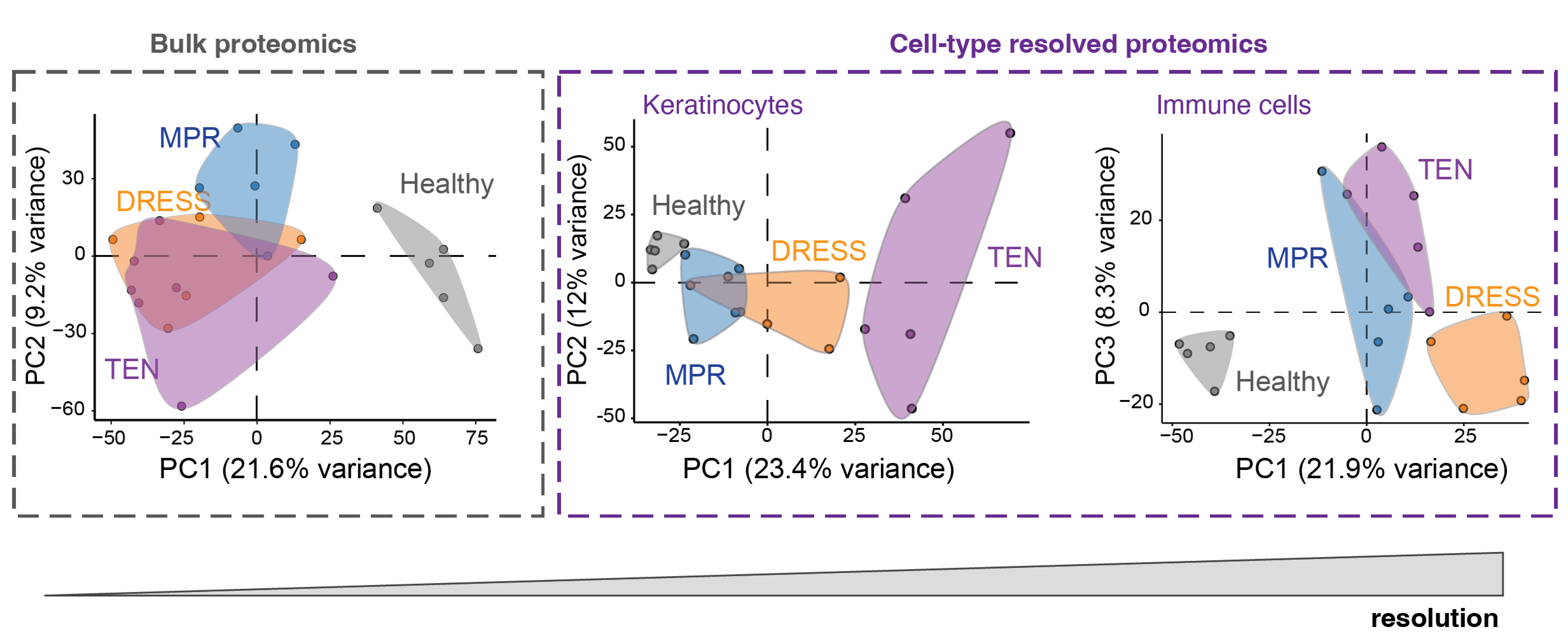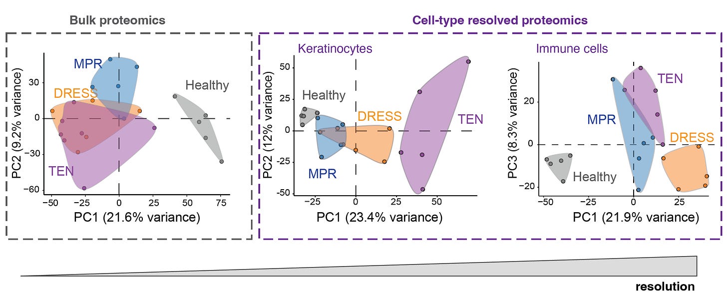 Published in Nature, Thierry Nordmann, Matthias Mann and their international consortium, used deep visual proteomics from 3μm PPFE sections of skin biopsies in patients affected by TEN, maculopapular rash (MPR), drug reaction with eosinophilia and systemic symptoms (DRESS), and in healthy controls. The number of patients assessed for each were 6, 5, 5, and 5, respectively