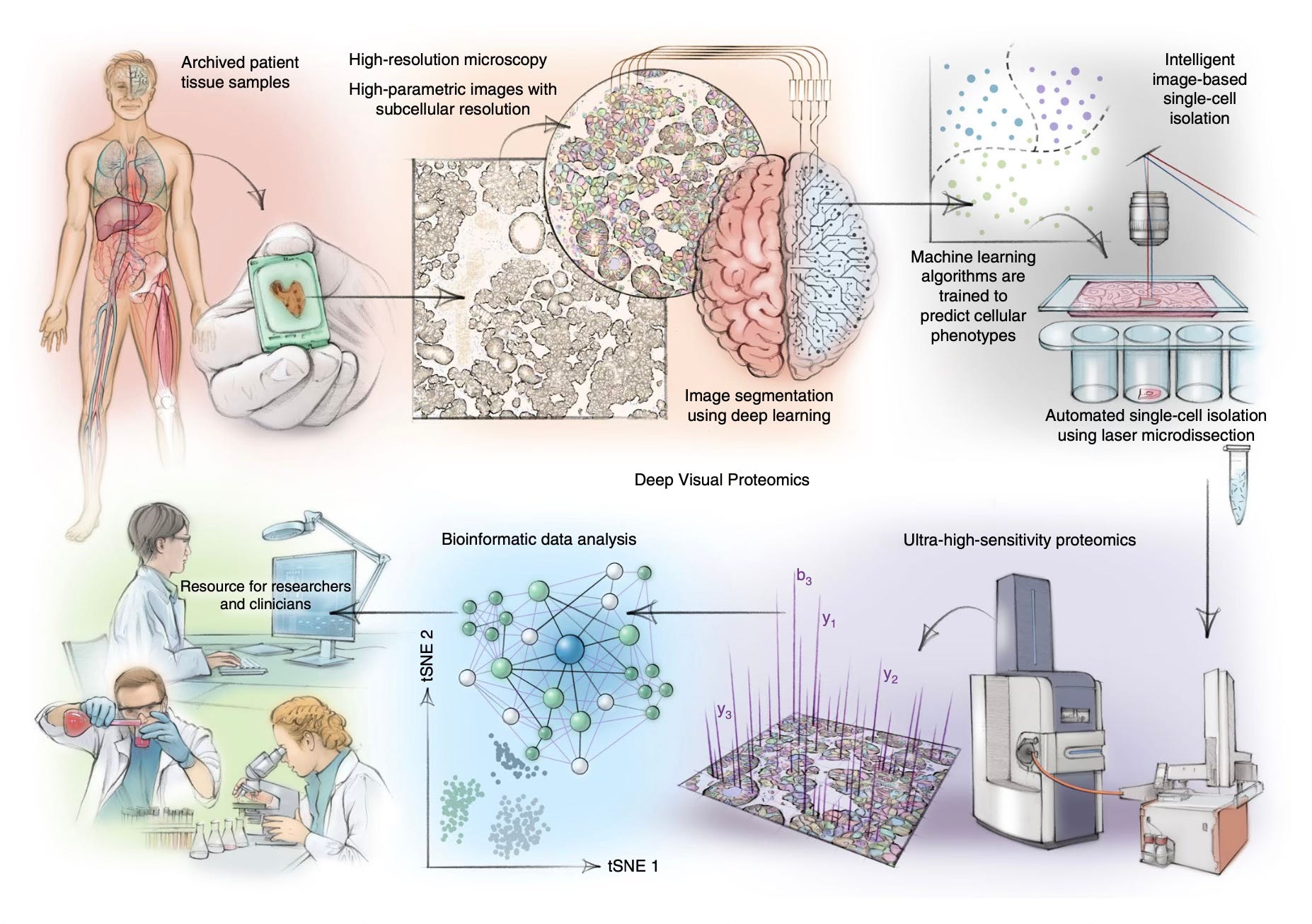 Back in 2022, Matthias Mann and colleagues introduced what they called Deep Visual Proteomics (DVP) graphically summarized below. From a patient sample of tissue (PPFE, formalin-fixed, paraffin-embedded), advanced microscopy using deep learning A.I. segments the image with resolution at the sub-cellular level. That identifies the target cells to be analyzed. Then laser microdissection (video below) is performed to excise single cells, followed by ultra-sensitive mass spectroscopy based proteomics.