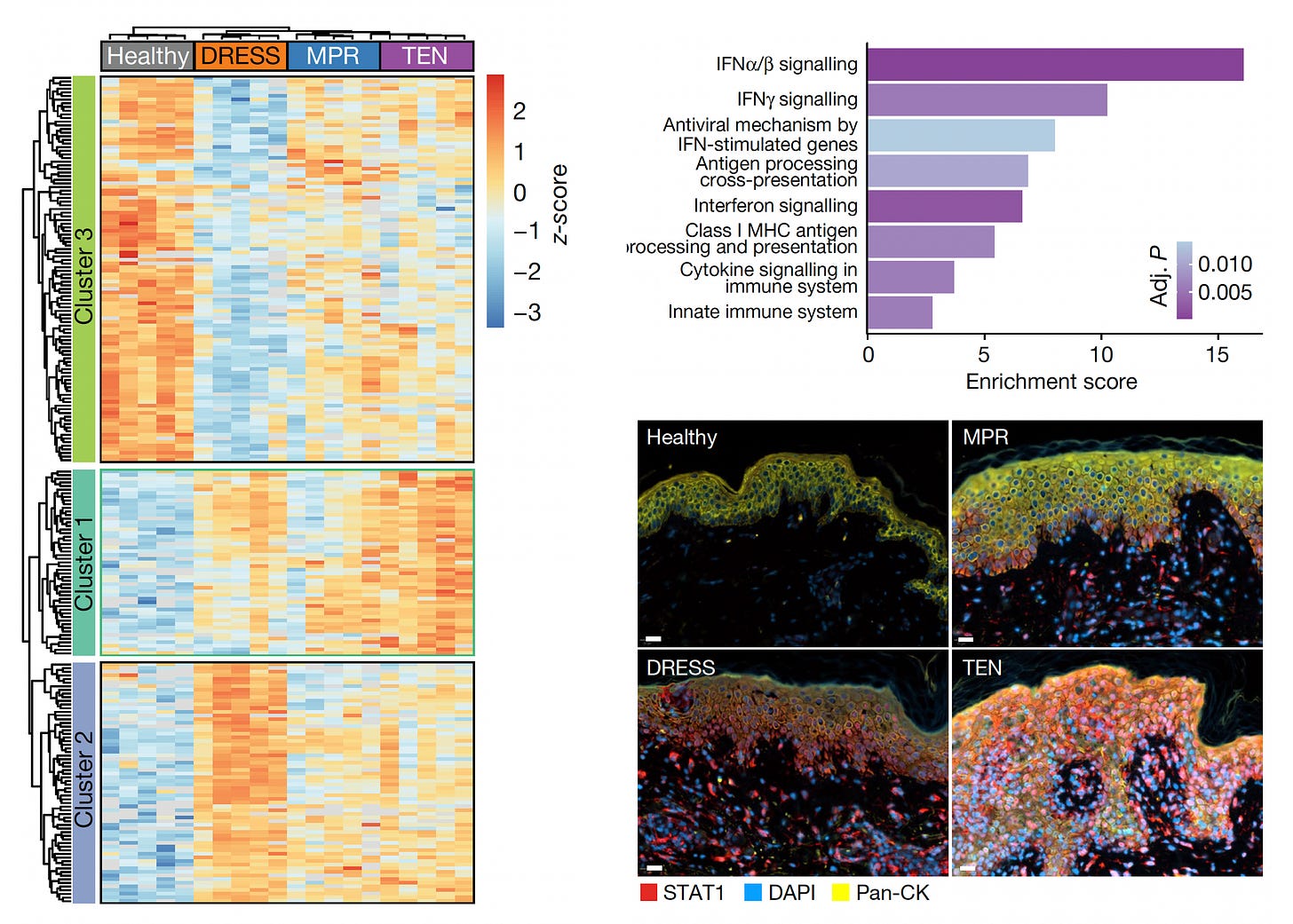 More than 5,000 proteins were quantified from single cells—keratinocyte and immune cells—using mass spec, for the 4 different skin conditions (proteome cluster in Figure below, left panel). This led to the finding that the TEN patients had marked increased in Type 1 and 2 interferon signaling and activation of phosphorylated STAT1, which invoked the janus kinase (JAK/STAT) pathway (upper and lower panels at right below). Within the immune cells, specifically the cutaneous macrophages compared with CD4+ and CD8+ T cells were noted for marked pro-infammatory activity.