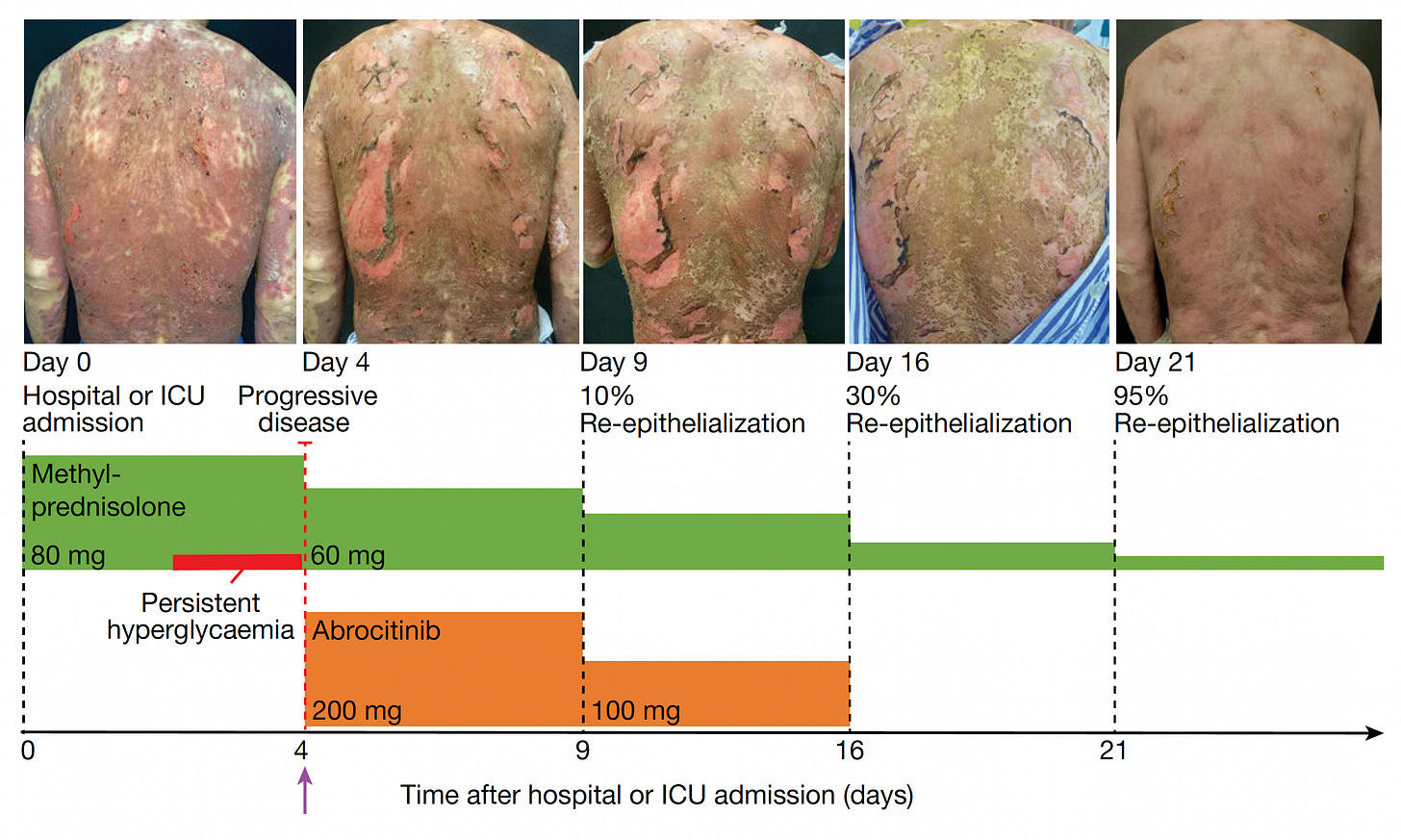 But the Mann-led international consortium work didn’t stop here! They went on to treat seven patients at Fuian Medical University, the course of one patient shown below, treated with a JAKi on day 4 after diagnosis, and manifesting a marked response starting within 48 hours. All 7 patients fully resolved, with no side effects. Unlike most first-in-human intervention reports where only the most impressive image is selected, all their photographs are presented in the supplementary information, Extended Figures 9 and 10. Warning: some of these photos are pretty gory.