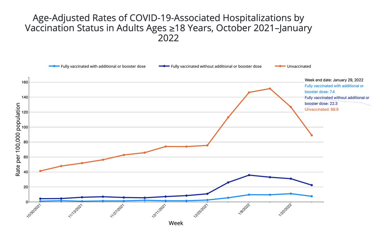 The vaccines, particularly with a booster shot, work exceptionally well to protect against hospitalizations and deaths, as I previously reviewed. The newly updated CDC data indicates a 3-shot 92% reduction of hospitalizations and a 96% reduction of deaths during the Omicron wave, through the end of January 2022, across all ages 18+. For only 2-shots, the reduction of hospitalizations was 75% and for deaths 85%.