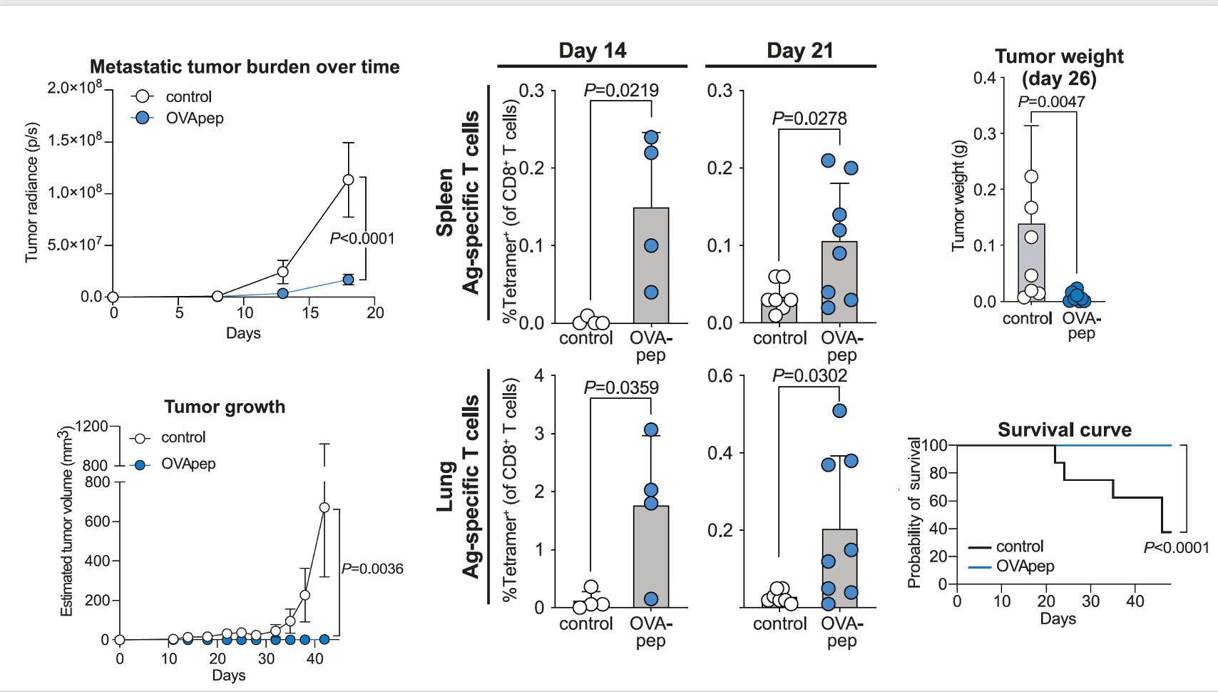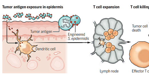 Akin to my recent post of discovering a better-than-natural antigen with RSV or SARS-CoV-2 for vaccines, this is about manipulating the genome of a skin bacterium (Staphylococcus epidermidis) to make antigens that elicit a potent T cell response against melanoma. These enhanced T cells were capable of migrating to distant skin melanoma graft sites well beneath and beyond the skin, including the metastases in the lung, with a very strong anti-tumor killing property—without causing inflammation. Notably, this approach did not result in infections, did not require intratumor delivery, and appeared to be synergic (more than additive) with immune checkpoint therapy. A series of experiments in the mouse model, as represented below, reinforced how effective the OVA-pep (ovalbumin-derived S. epidermidis constructs of full peptide), was relative to control for tumor burden, tumor growth, T-cell response, tumor weight, and survival. If the engineered antigen was not present, these salutary effects were not seen. This can be seen as a potential new means of immunotherapy for cancer and more broadly a novel pathway to modulate our immune response.