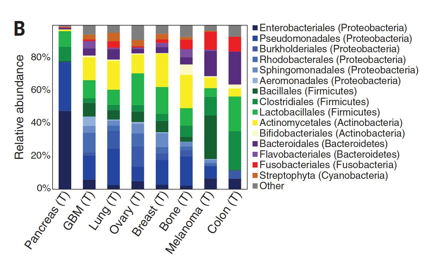 Specific bacterial species were correlated with cancer types as shown below. Other reports since this publication have demonstrated that virus and fungi can be present within tumors, but their frequency and significance is less known.