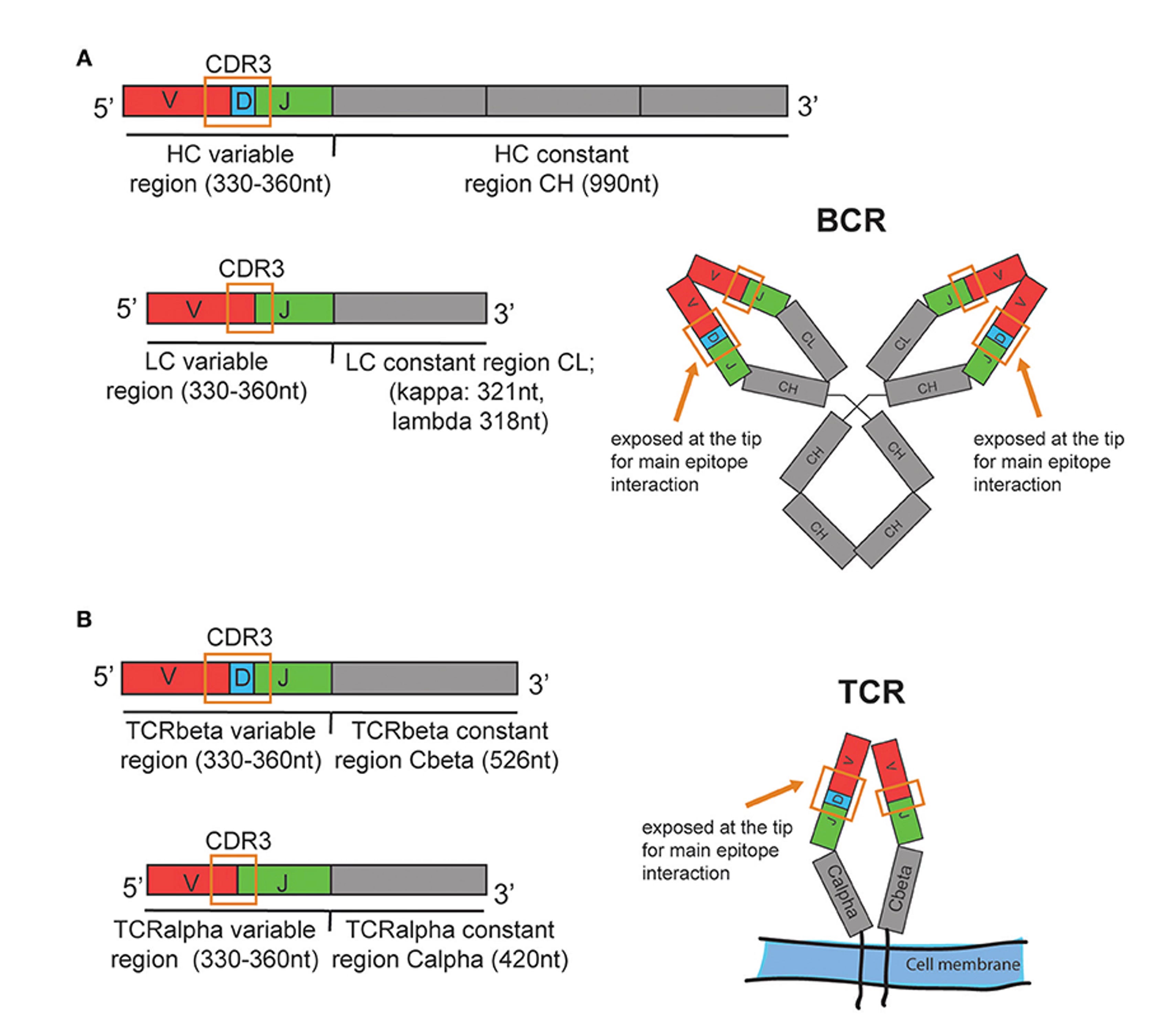 B and T lymphocytes contain a treasure chest of information about our immune response to pathogens, vaccination, environmental exposures, and untoward, self-directed attack (to our organs, tissues, and cells). The B and T cell receptors are like antennas, extending outside the cell (Figure below), that act as the sensors to mount a response to these different antigens. Their response is stored, but these receptors are exceedingly complex to decode because their diversity is extreme, with extensive gene rearrangements and somatic mutations. Until now, sequencing these receptors has not been used to diagnose an autoimmune condition or exposure to a pathogen. Their only clinical use case to date has been quite rare, in certain lymphomas for diagnosis and management.