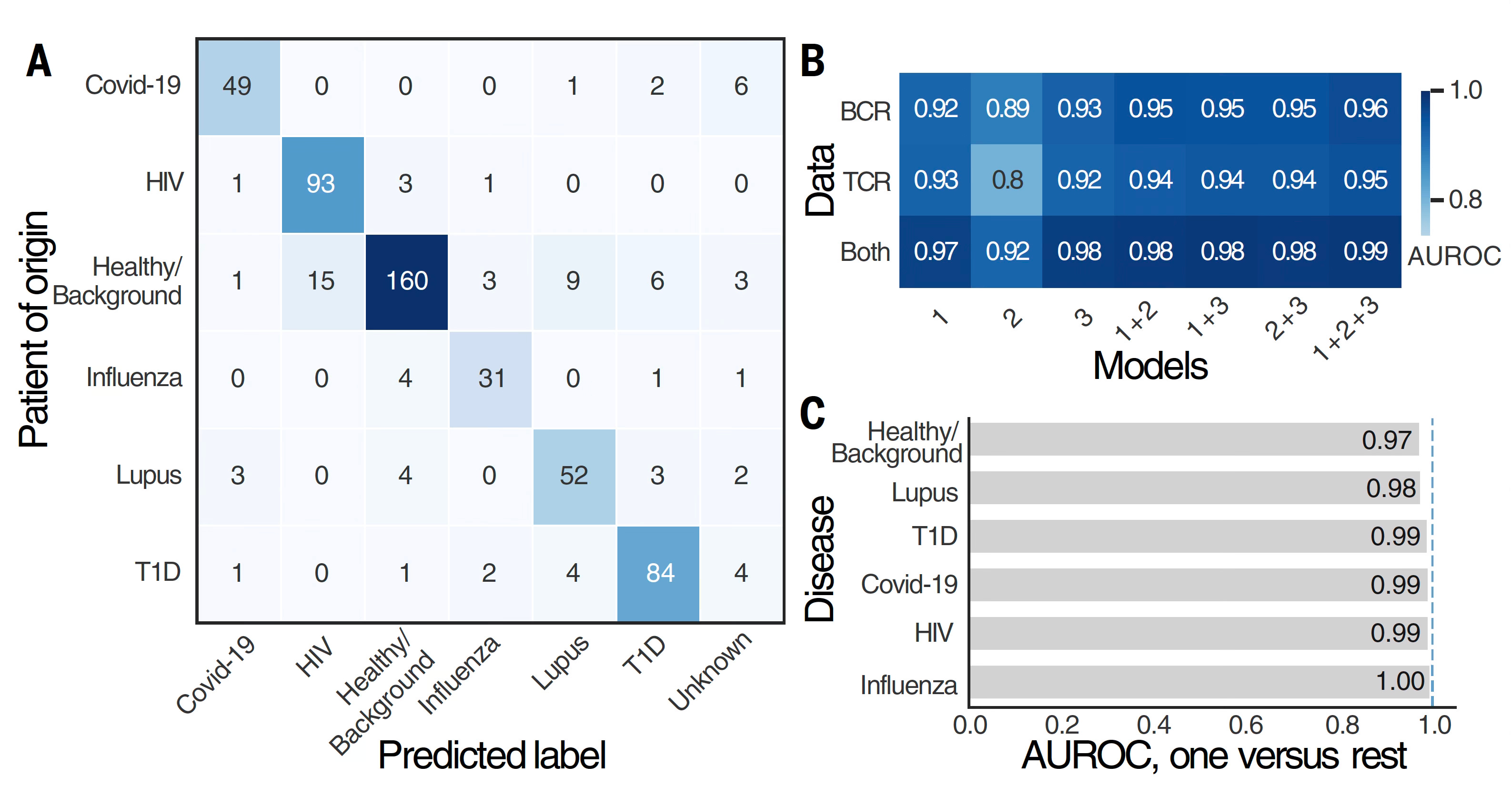 Below are the classification by BCR and TCR for the different diagnoses, with remarkable accuracy, an area under the receiver operative characteristic curve (AUROC) of 0.986 (1.0 = perfect). It’s a measure of model performance reflecting accuracy for correct classification. Usually when you’d see such a high value, it would be considered too good to be true. I’ll get to the reason for such a high AUROC a little later. You’ll note that having both BCR and TCR data brought the level of accuracy higher, maxed out with all 3 models (1+2+3) at 0.99 (top right). Although it might seem an increase in AUROC from 0.93 to 0.98 (Model 3 alone) is not much numerically, it actually is meaningful as can be distinguished in the confusion matrix displays of data (one of which is in Panel A below, many in the extensive Supplemental data).