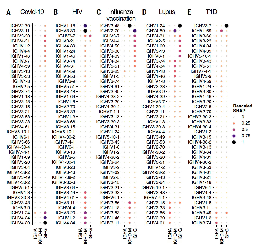 The other main output of results pertained to identifying specific patterns in the BCR and TCR genes related to particular conditions (output from Model 3 below, SHAP=Shapley importance of ranking). These data were presented as immunoglobulin heavy chain variable region (IGHV) for each condition, and were decomposed to isotopes (specific antibodies) such as in IgA or IgG. What is noteworthy is that many of these genes correlated with known underpinnings of the various conditions, such as lupus, type 1 diabetes, or HIV, and several were new loci that may turn out to expand upon our current knowledge base.