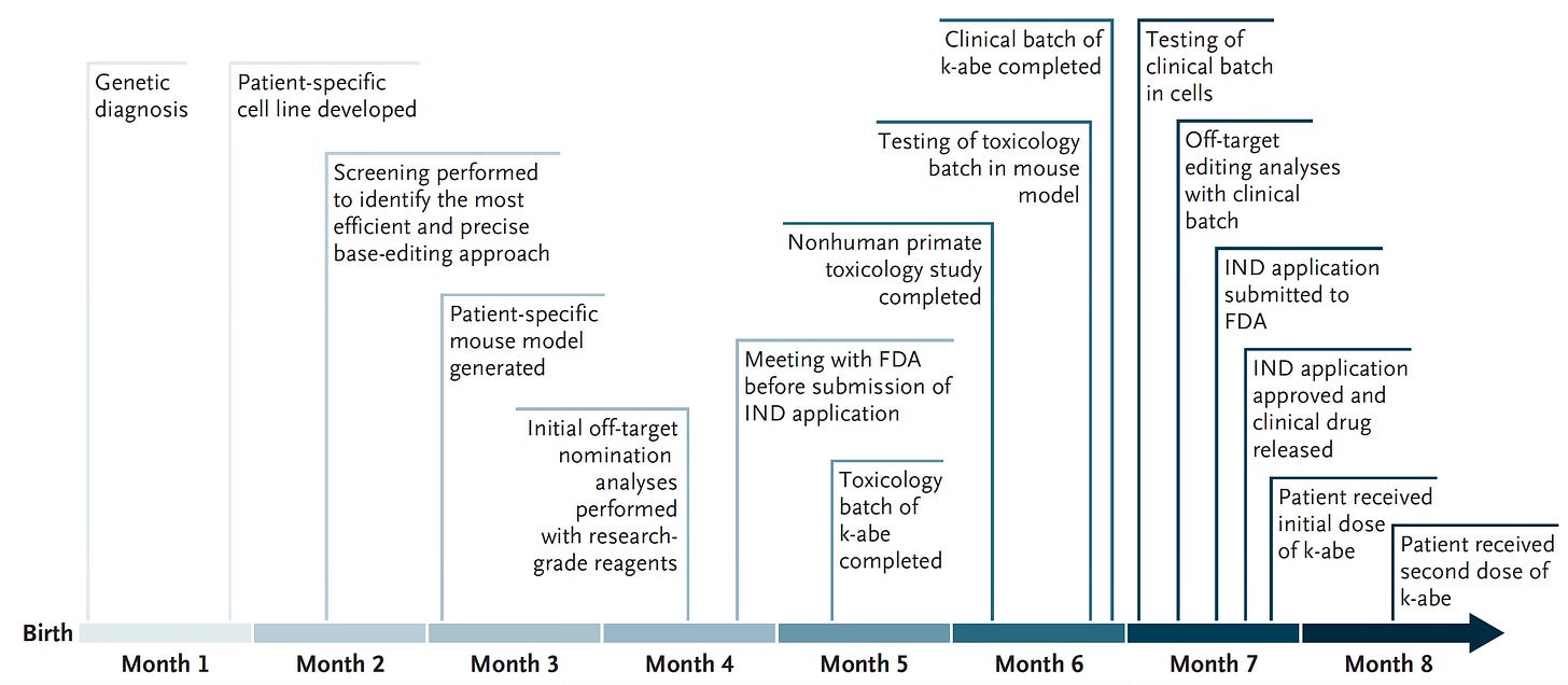 The most important takeaway is that we have a new way of approaching rare disease with base and prime editors which account for ~90% of disease causing genetic mutations. Recall that there are about 10 thousand genetic rare diseases affecting ~6% of the world’s population, or about 400 million people. The overall global burden of rare and ultra-rare genetic diseases is huge, Were the approach pioneered in this case report made scalable, less expensive, and practical, imagine how many people could benefit.