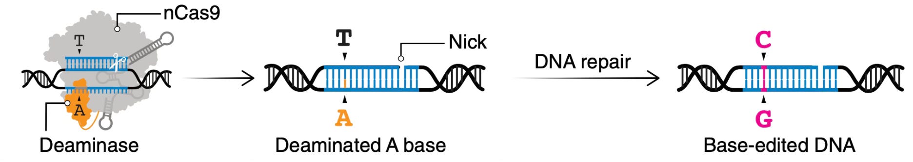 Instead of a double-strand break, base editing (pioneered by David Liu and colleagues, and discussed in our podcast) creates a single-strand nick (Figure below from Wang et al) and sets up a precise single base pair substitution, such as changing A's into G's G's into A's T's into C's or C's into T's. This constitutes directly fixing of the defect by doing chemistry of an individual’s DNA base.