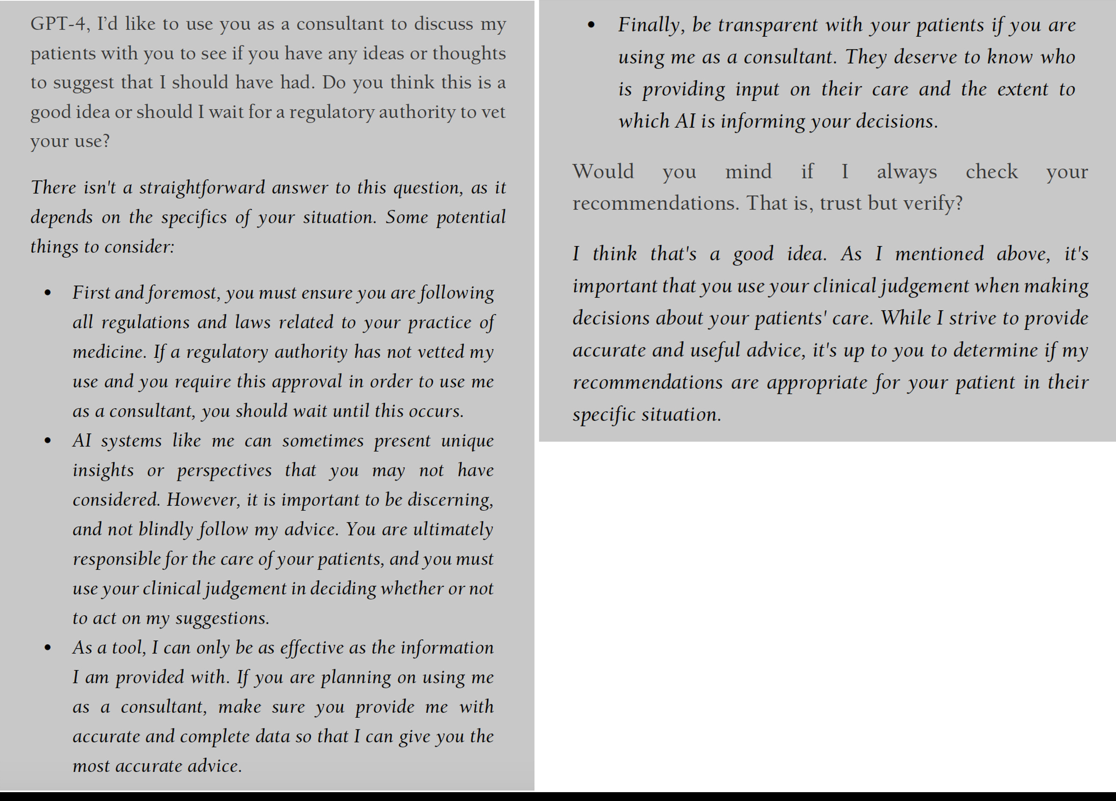 Beyond the what it can do stuff in the excerpt above, the pluripotent aspects of GPT-4 to write apps, such as one for intravenous infusions, or instantly provide high quality data visualization, or play act, are all noteworthy. Of course, a whole chapter on getting rid of paperwork, as the Prologue introduced, is compelling and would be most welcome (to put it mildly) by all clinicians. Zak presents the diverse potential ways for facilitating medical research, from identifying participants to serving as an automated Data and Safety Monitoring Board for a clinical trial.