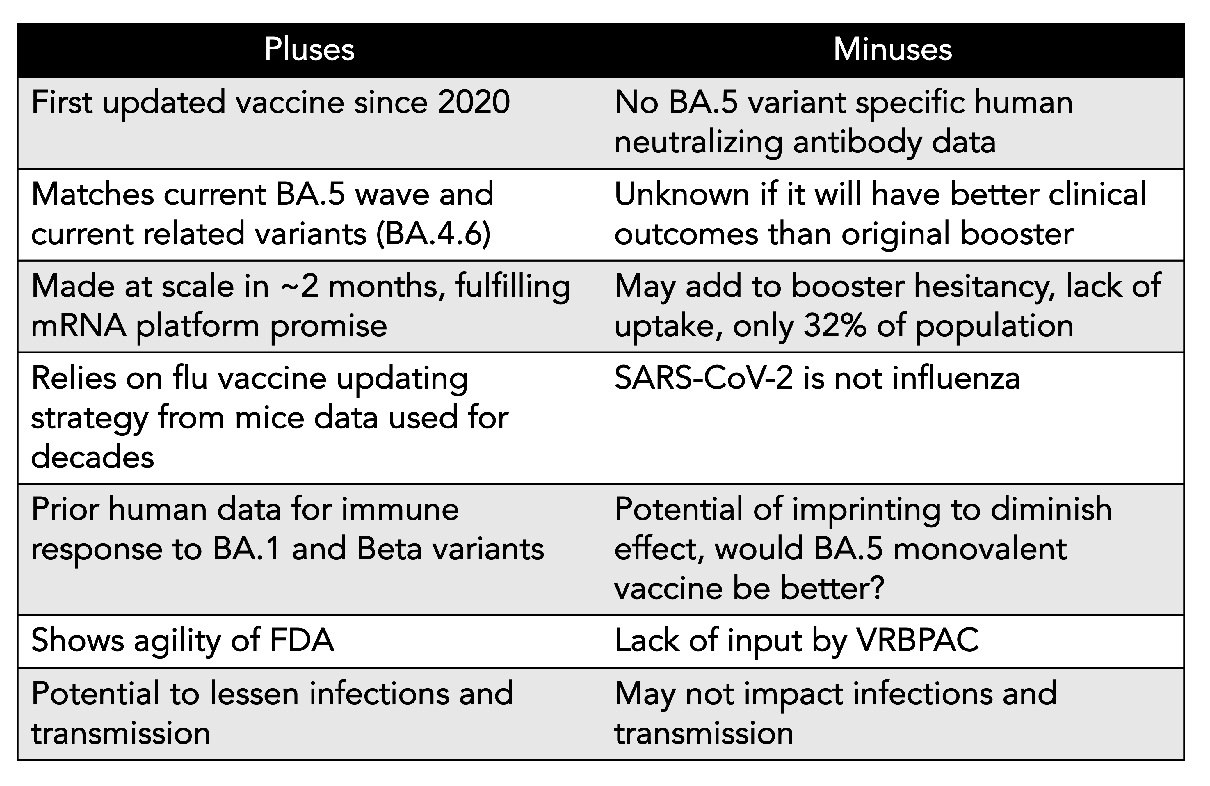 The FDA should be commended for wanting to take an aggressive, expedient approach. BA.5 is the variant now, and the only other co-existing variant in the US at >7% is BA.4.6 which should also be well suited for a BA.5 vaccine. It’s actually striking that in 2 months from the June 28th FDA meeting, there is a BA.5 vaccine booster made at scale. That is finally in keeping with all the excitement about the plasticity of the mRNA vaccine platform, that it could be ideal for rapid updating. We’ve seen that play out now which is exciting. Think pandemic preparedness and management in the years ahead.